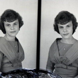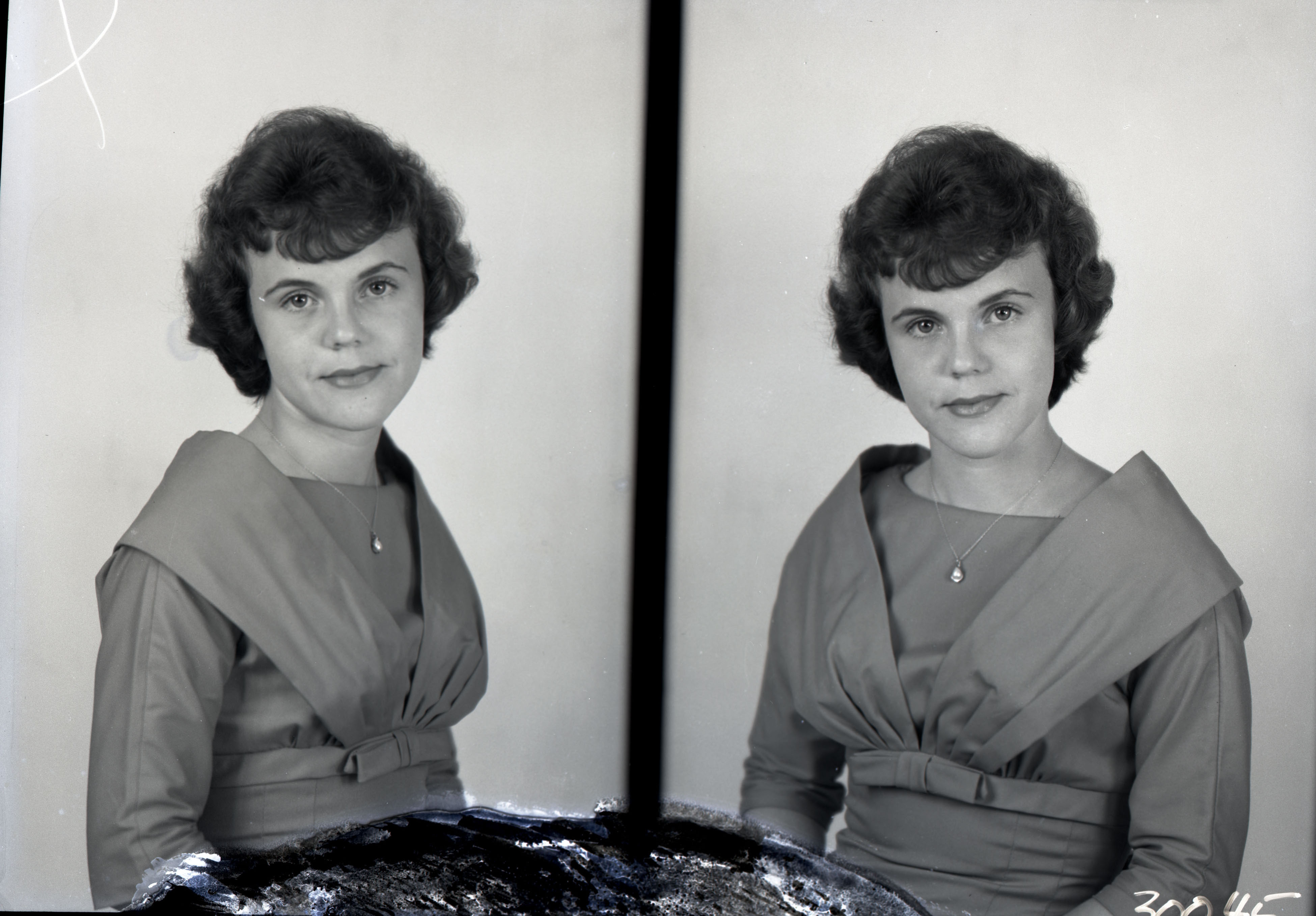 Photo of two separate portrait photographs of the same unidentified woman with short hair.