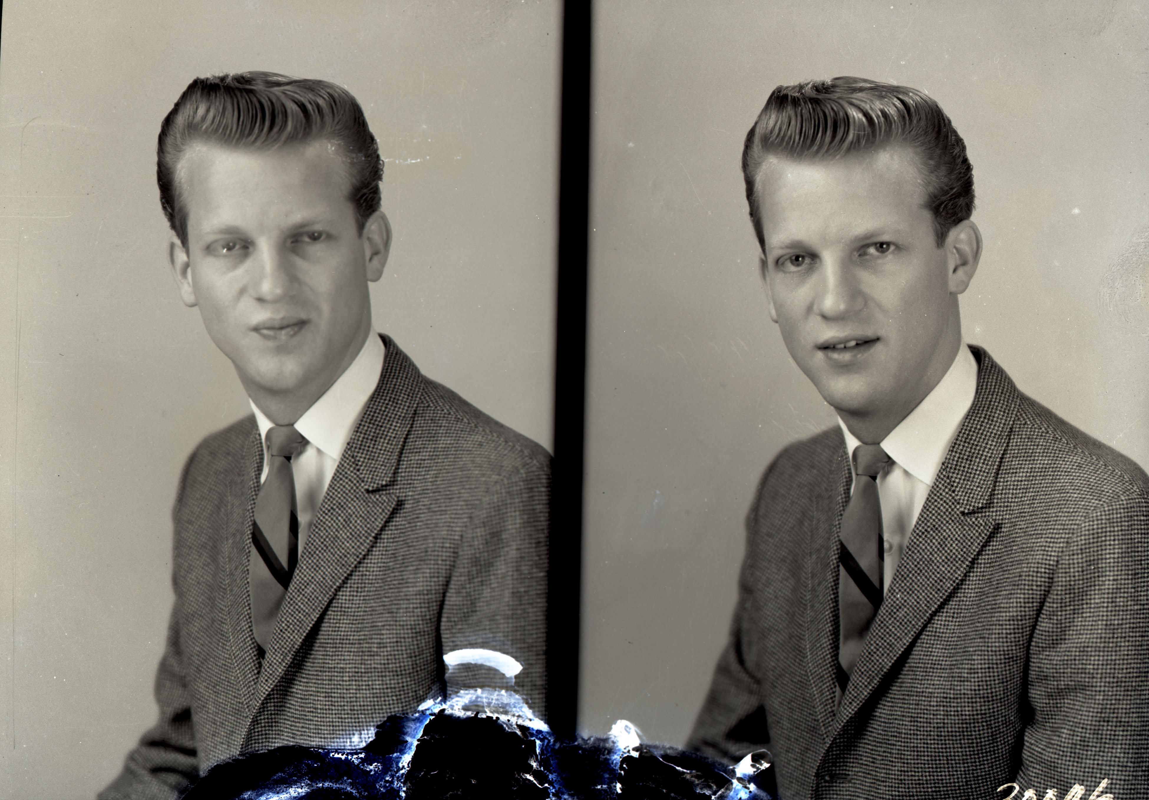 Photo of two separate portrait photographs of Clinton Miller as a young man wearing a suit and tie.