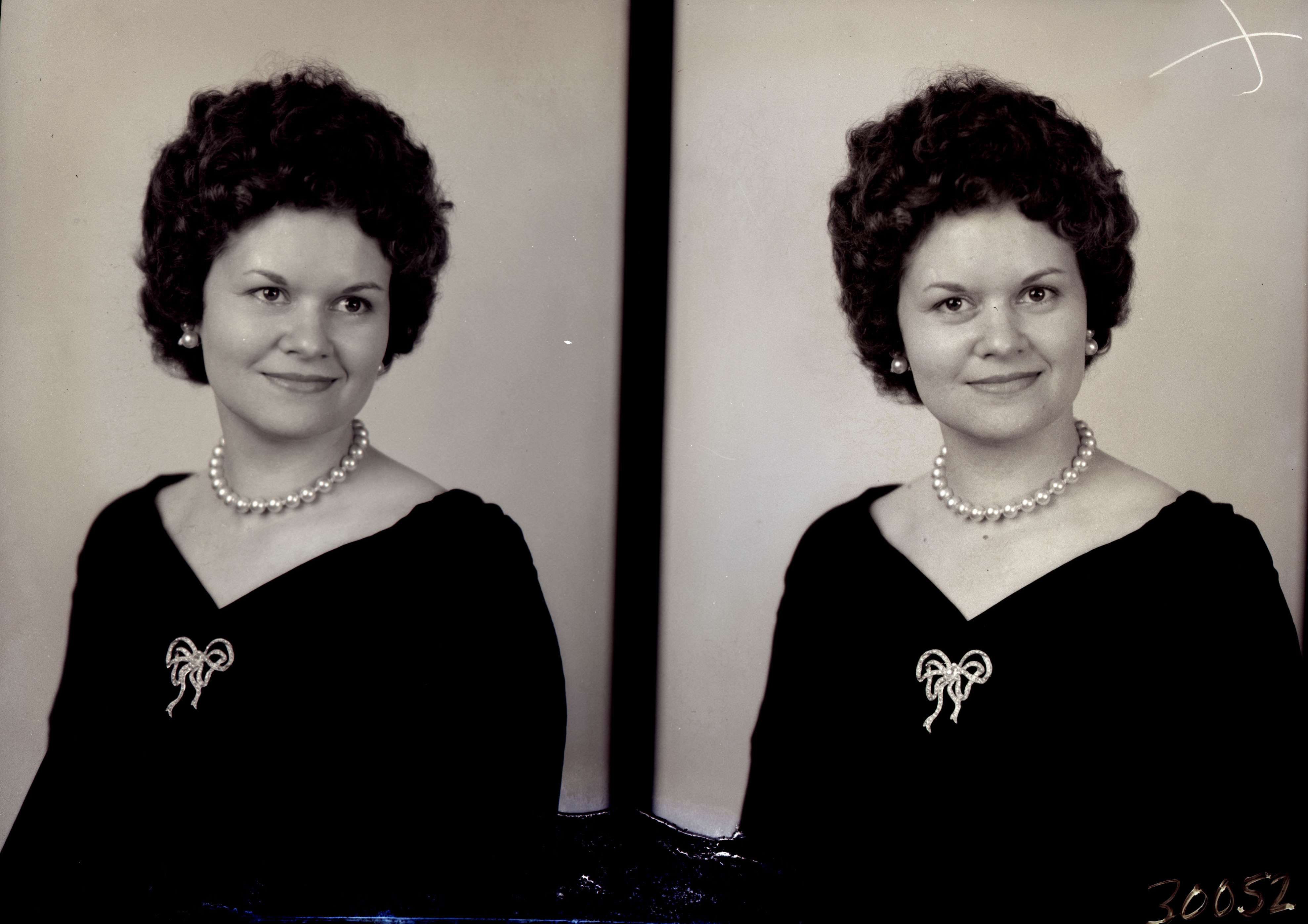 Photo of two separate portrait photographs of the same unidentified woman with short hair, earrings, and wearing a faux pearl necklace.