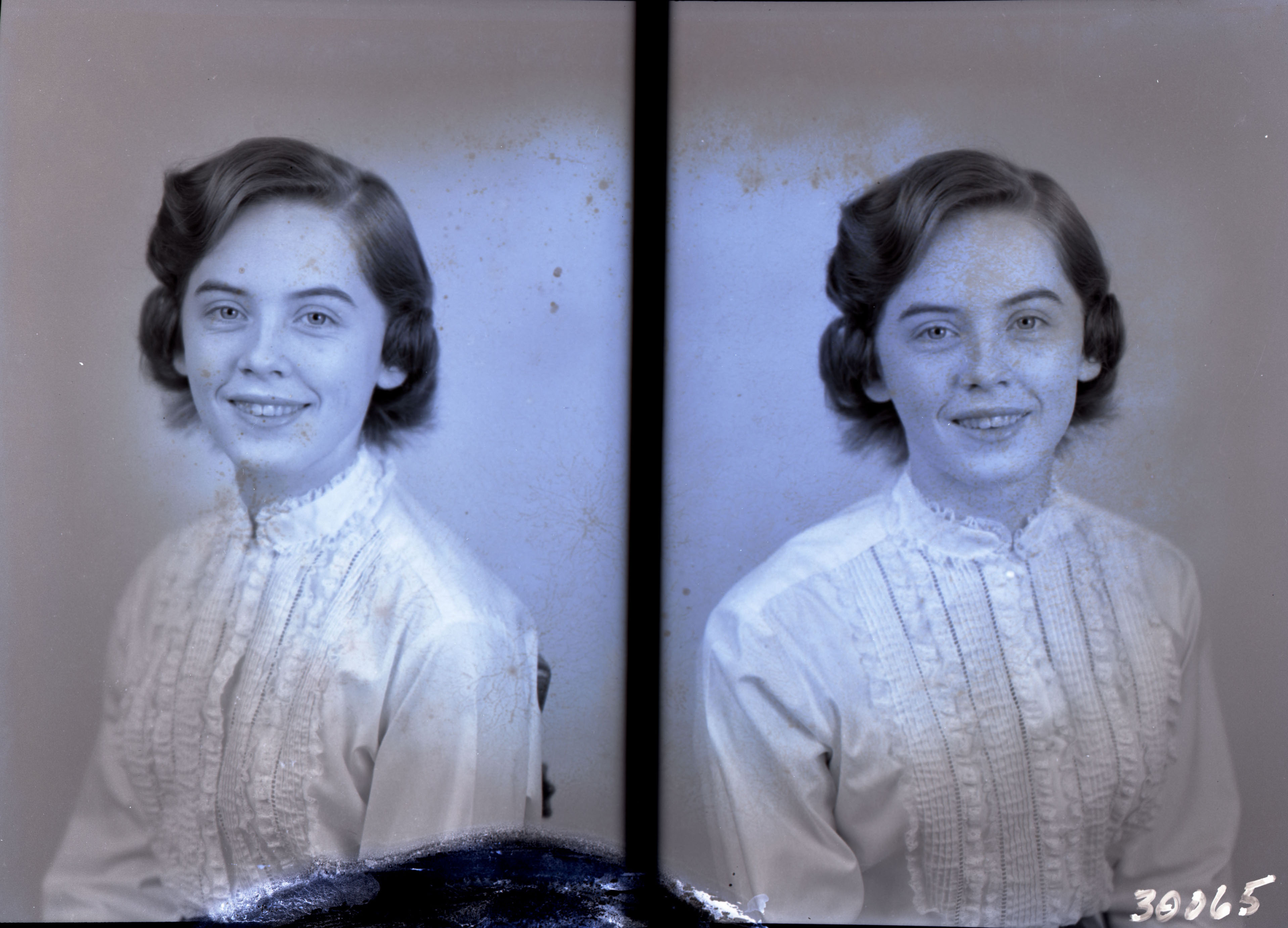 Photo of two separate portrait photographs of Marsha Gregory as a young woman with short hair.