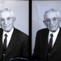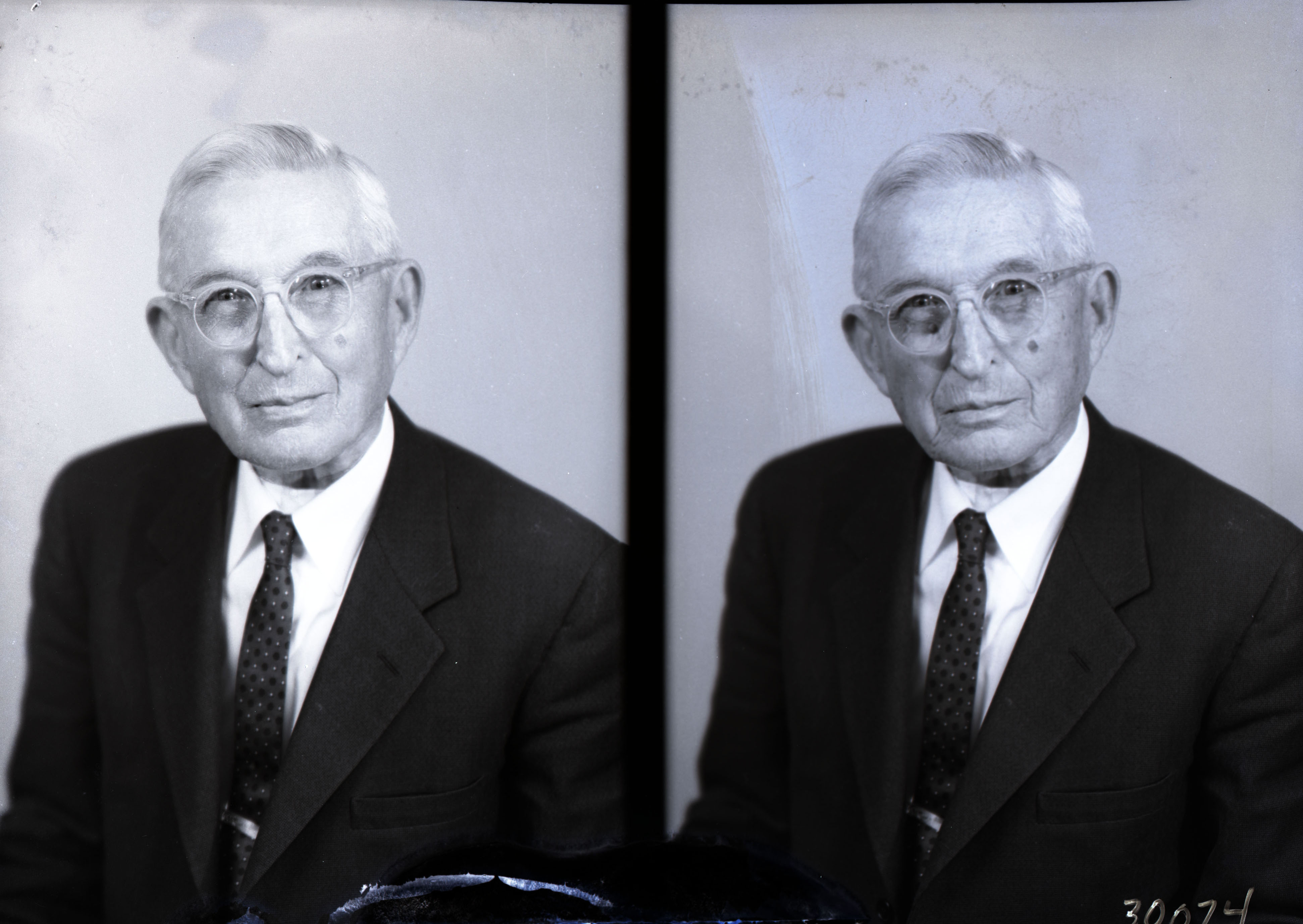 Photo of two separate portrait photographs of the same unidentified older man with glasses and wearing a suit and tie.