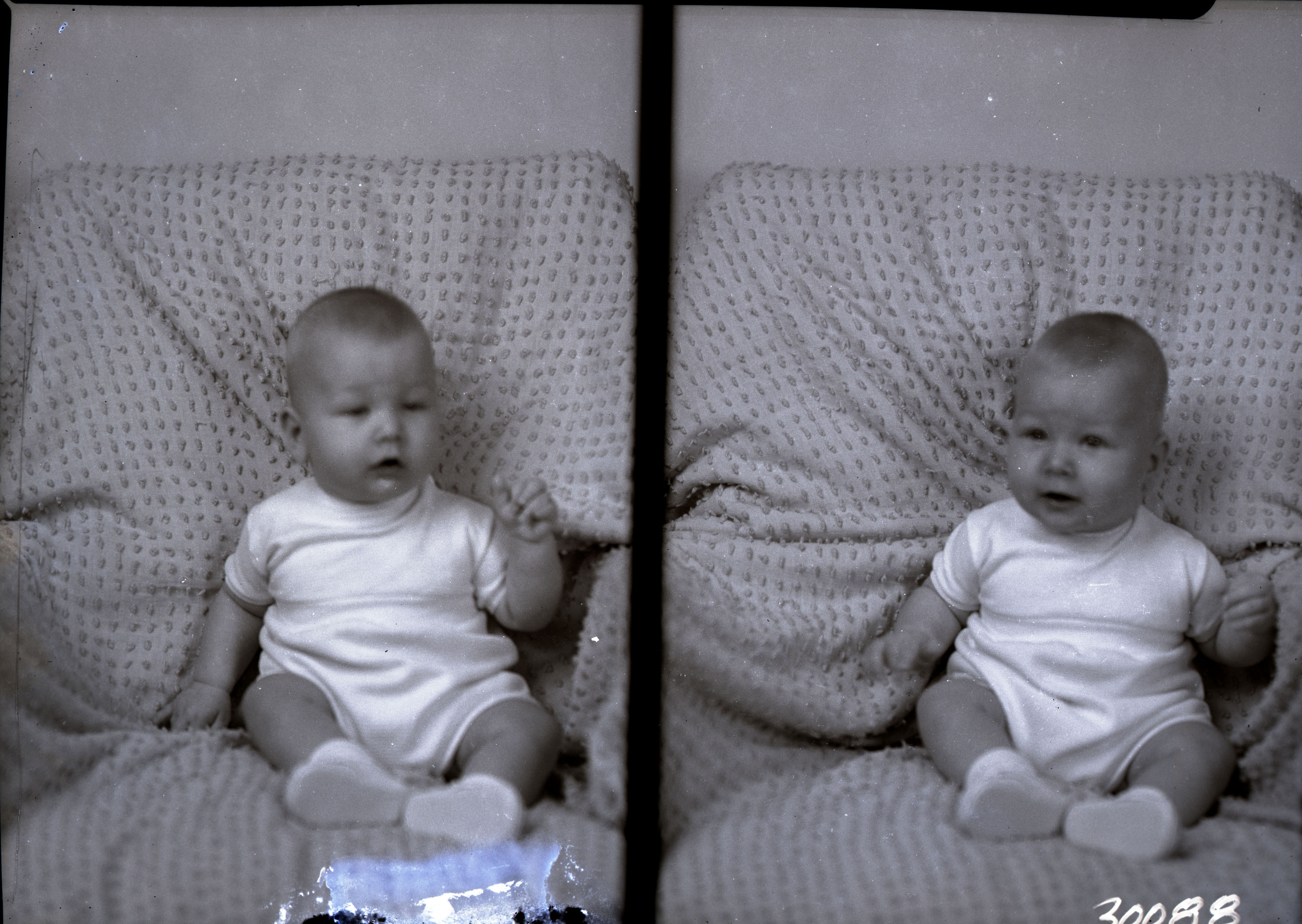 Photo of two separate photographs of the same unidentified baby on a covered surface.