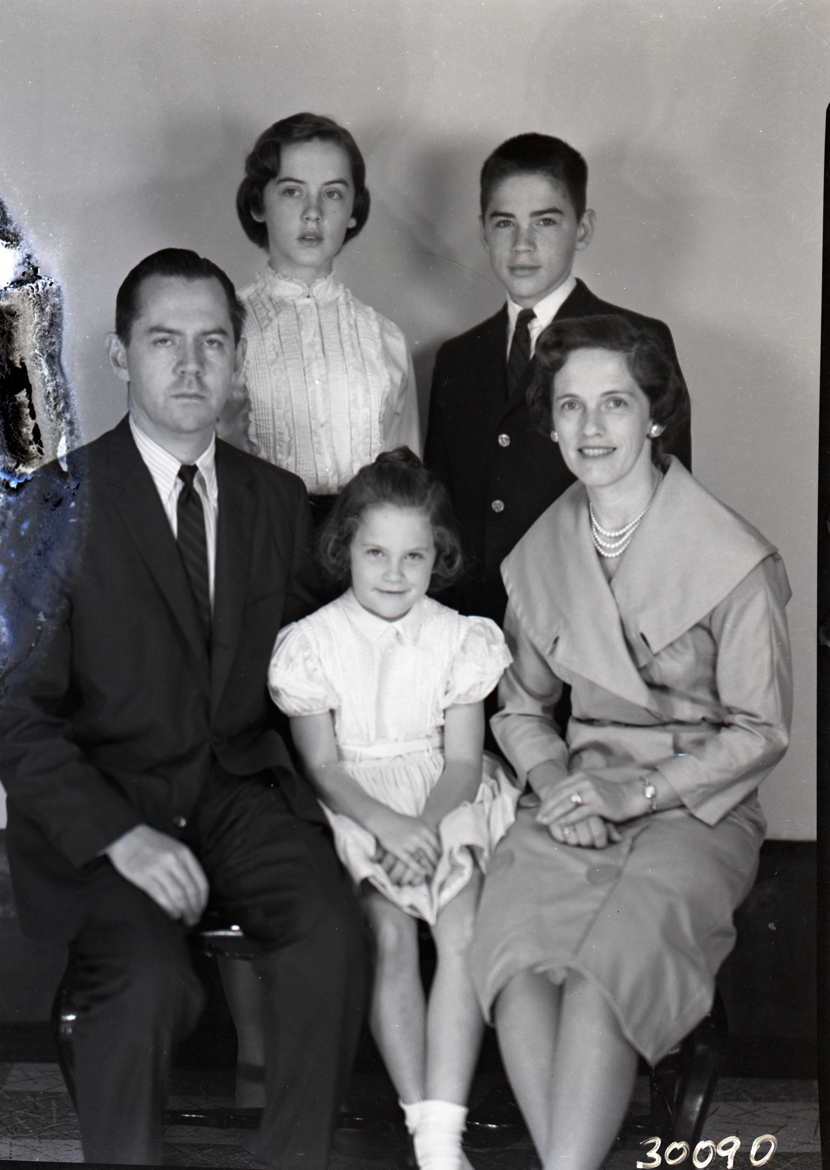 His daughter, Marsha Gregory, is standing on the left behind him. The other members of his family are unidentified.
