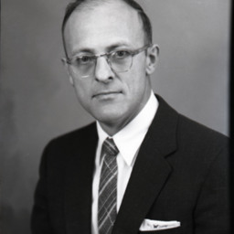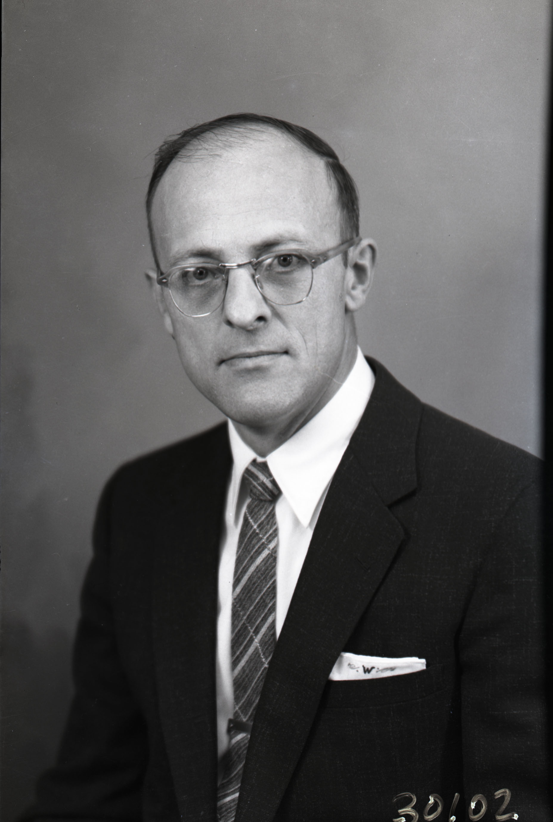 Portrait photograph of an unidentified man with glasses wearing a suit and tie with a monogrammed handkerchief in his breast pocket. The letter, "W", is visible.