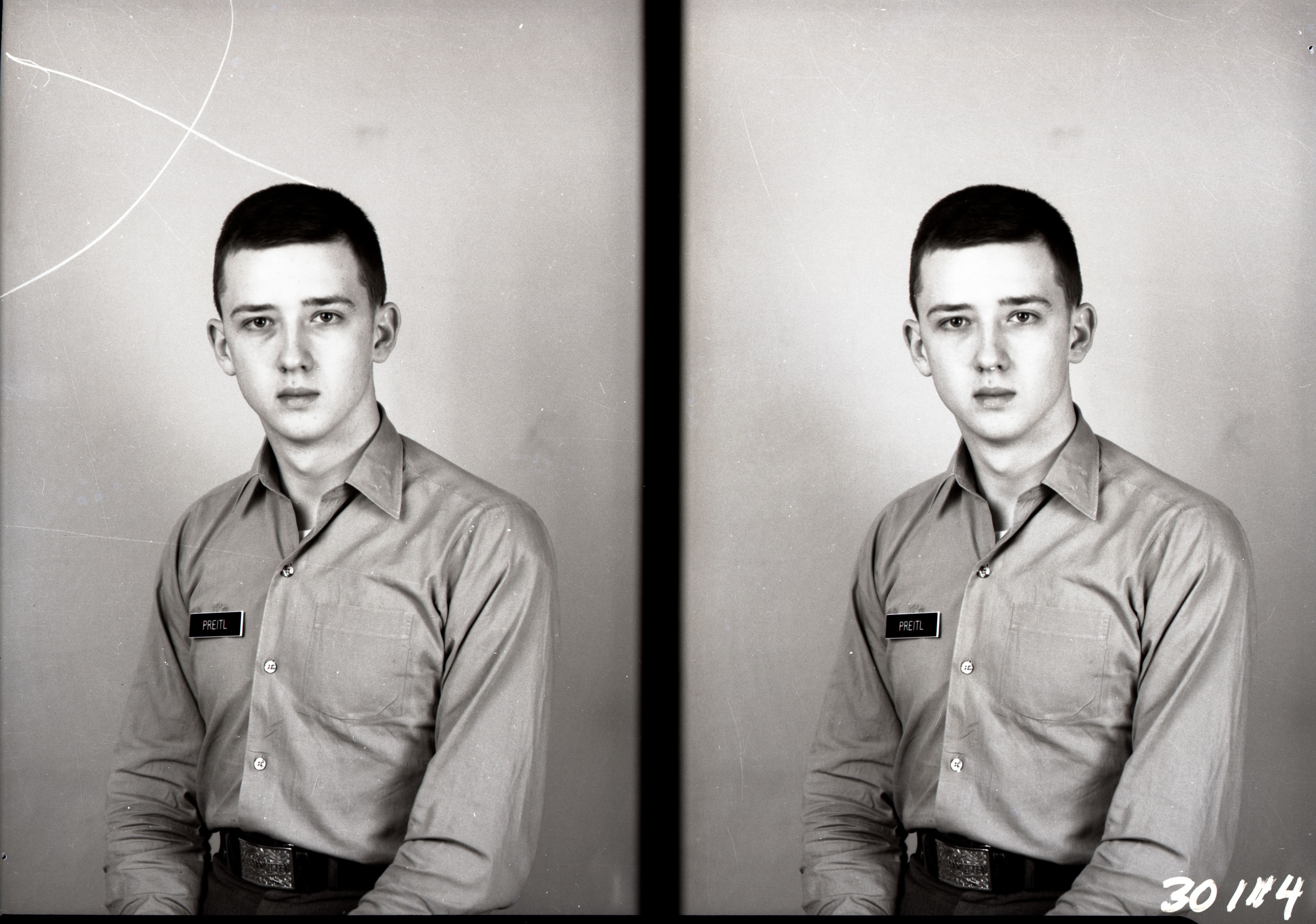 Photo of two separate portrait photograph of a young man wearing a name tag on his collared shirt that says, "Preitl".