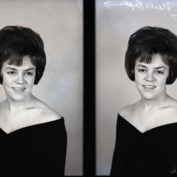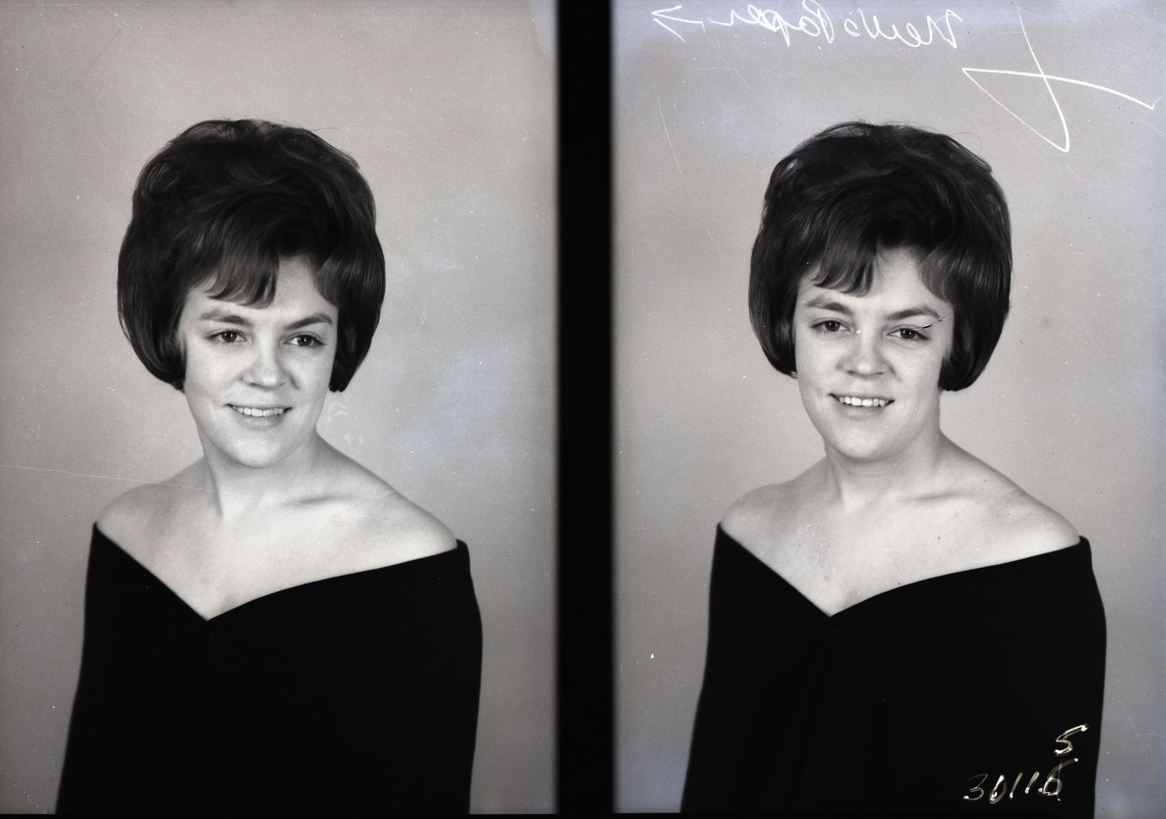 Photo of two separate portrait photographs of the same unidentified young woman with short, styled hair.