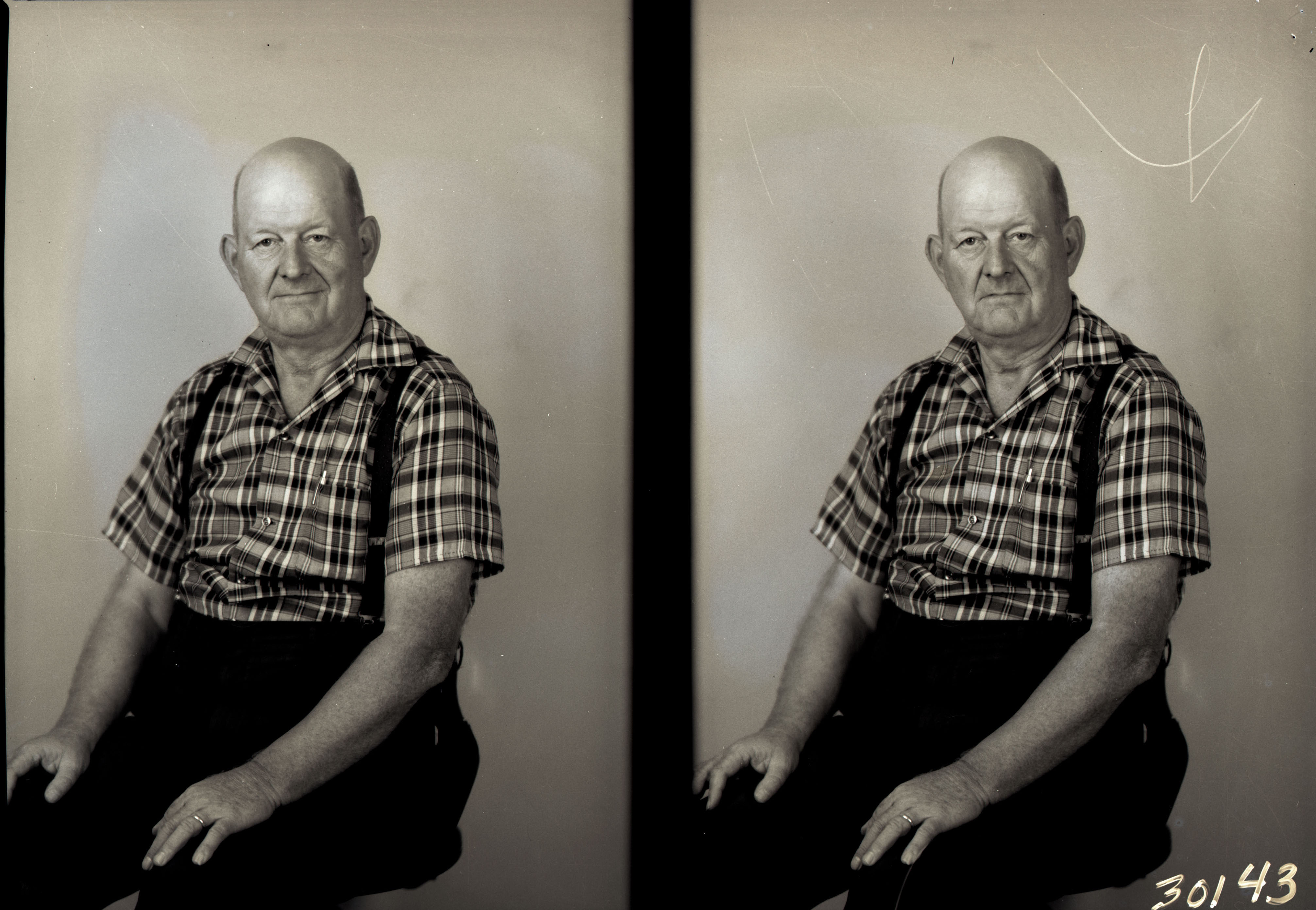 Photo of two separate photographs of the same unidentified older man wearing suspenders and a plaid, short-sleeved shirt.