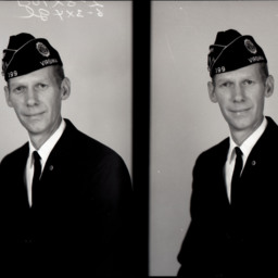 Photo of two separate portrait photographs of the same unidentified man in an American Legion cap with the Woodstock Chapter, "199" on it.