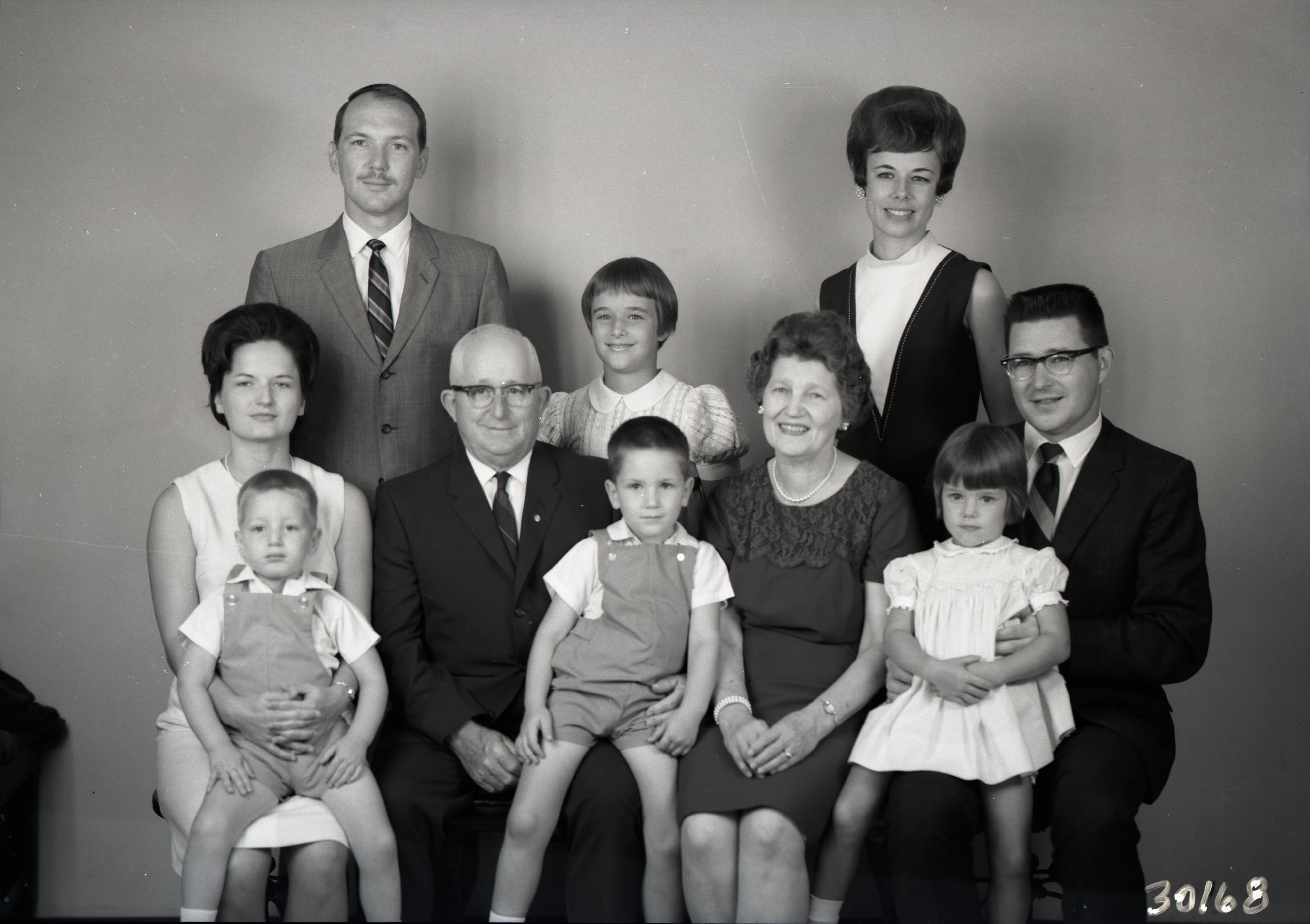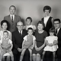 Unidentified older couple seated in the center of the photograph with their grown children and their respective families posed around them.