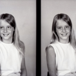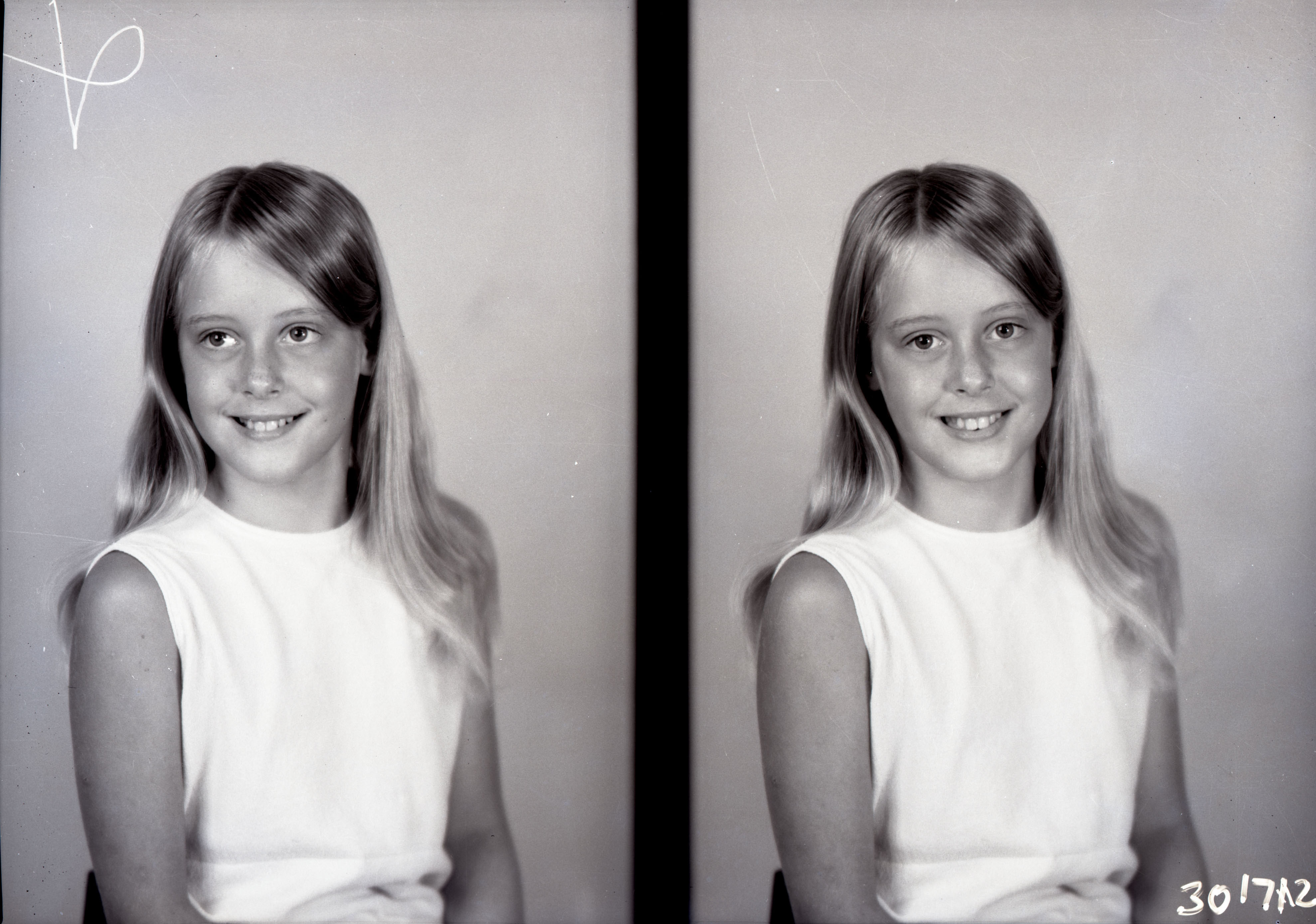 Photo of two separate portrait photographs of the same unidentified girl with long, straight hair and a smile.
