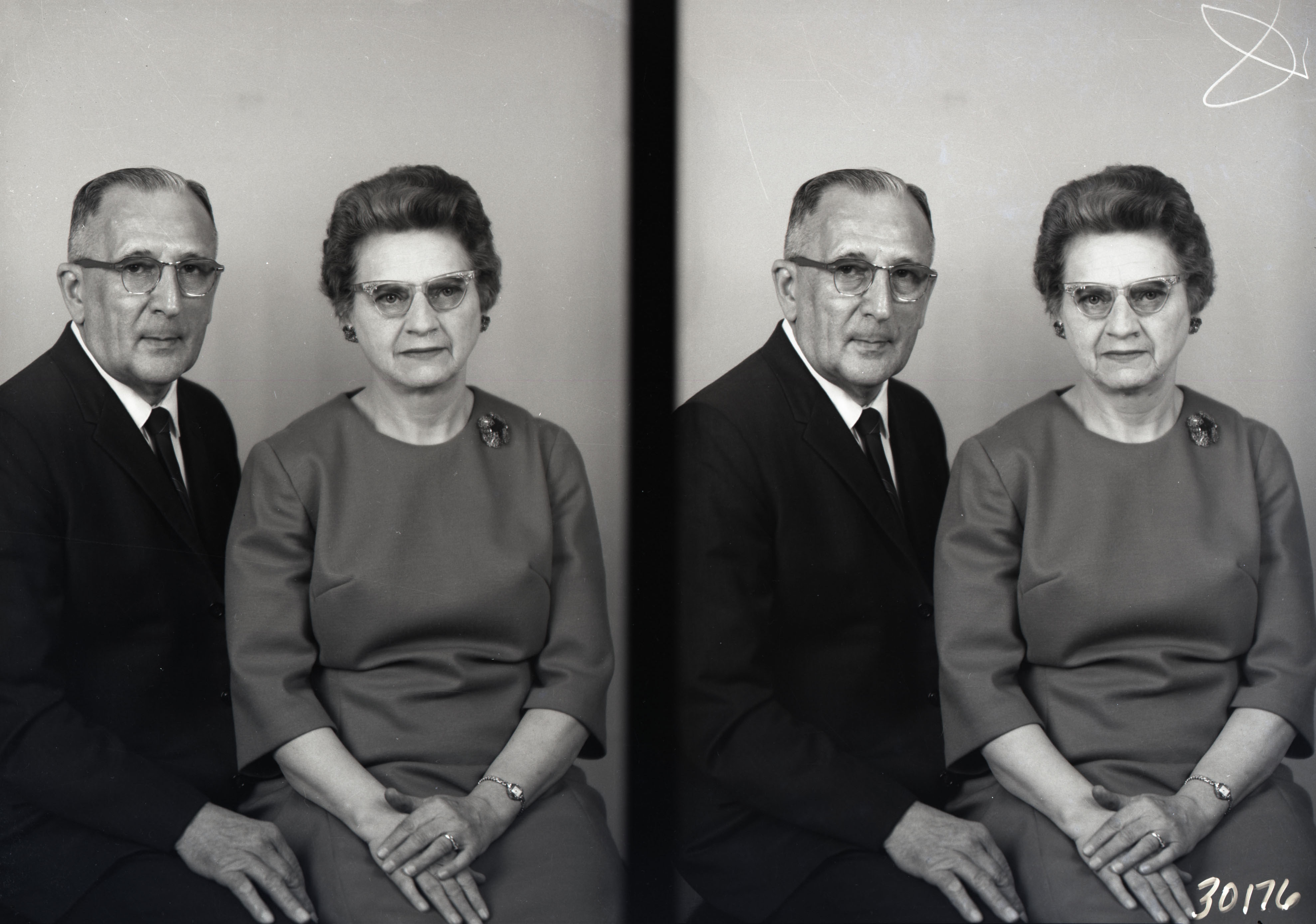 Photo of two separate portrait photographs of the same unidentified older man with glasses and woman with a pin on her dress.