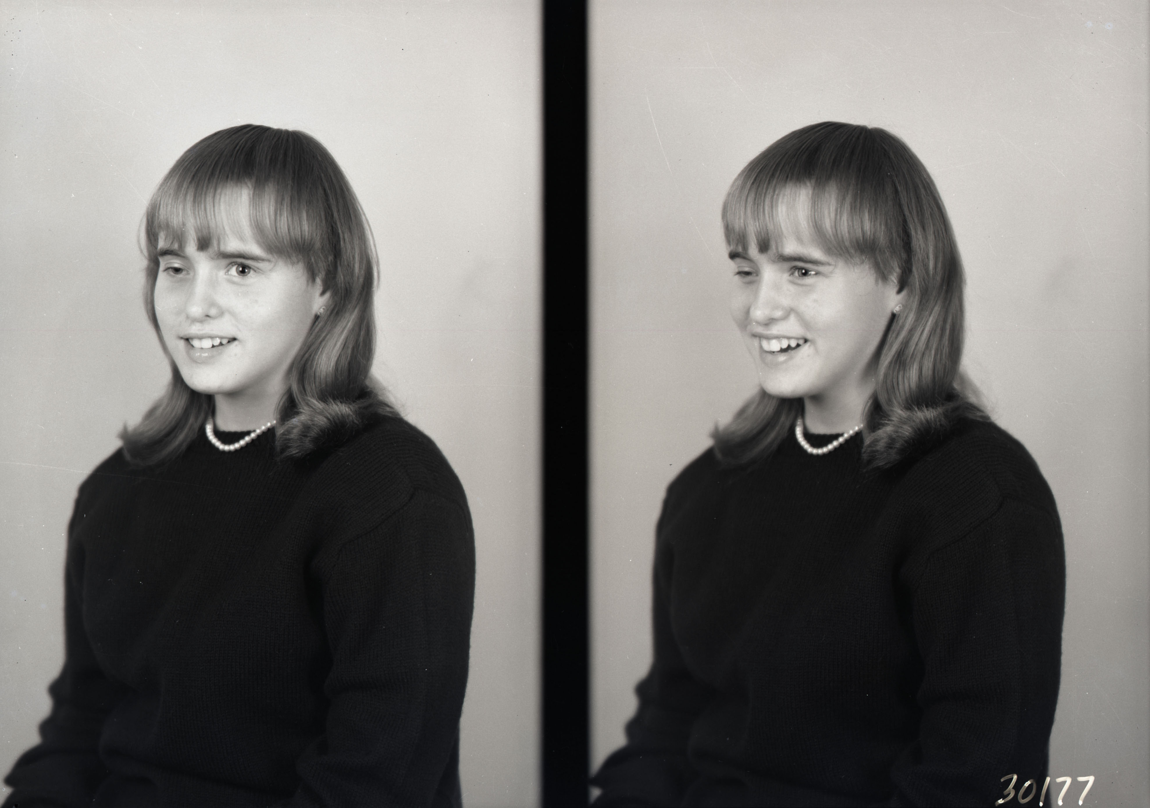 Photo of two separate portrait photographs of Debbie (Wright) Good as a young woman.