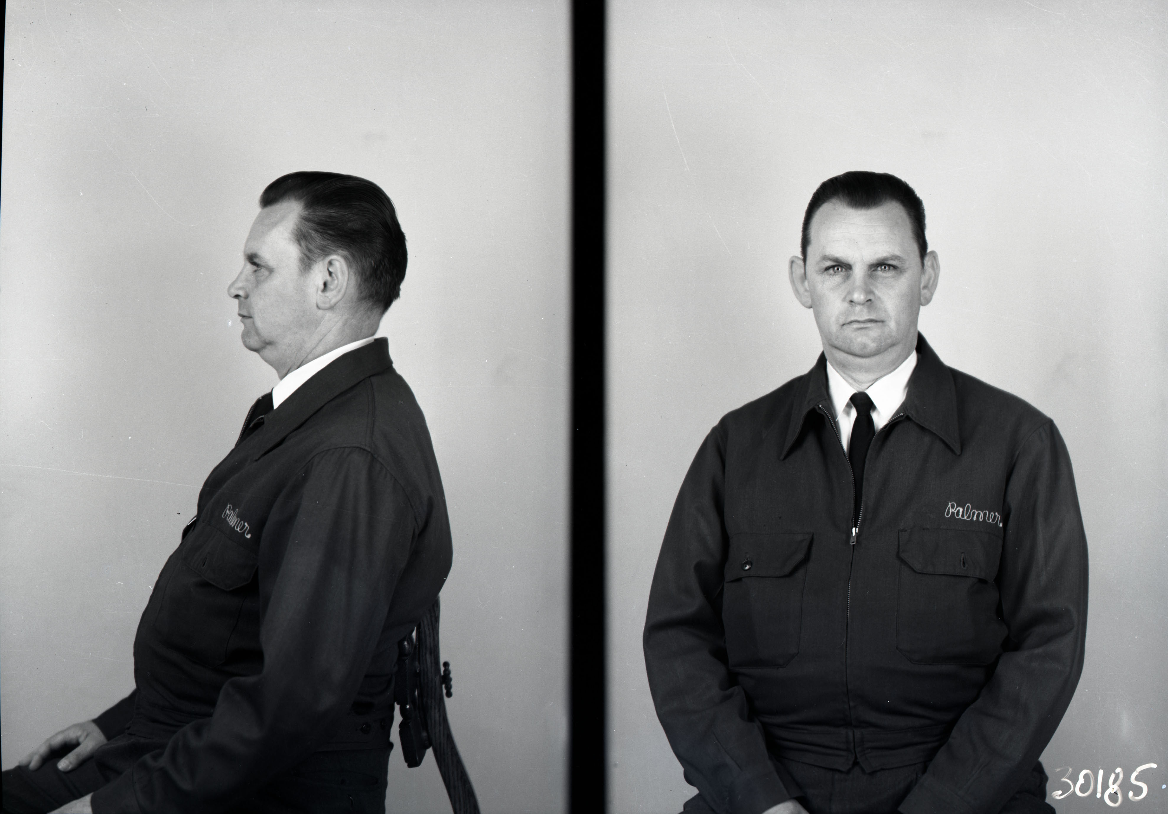 Photo of two separate portrait photographs of the same unidentified man in a work uniform. The name, "Palmer", is stitched on the front.