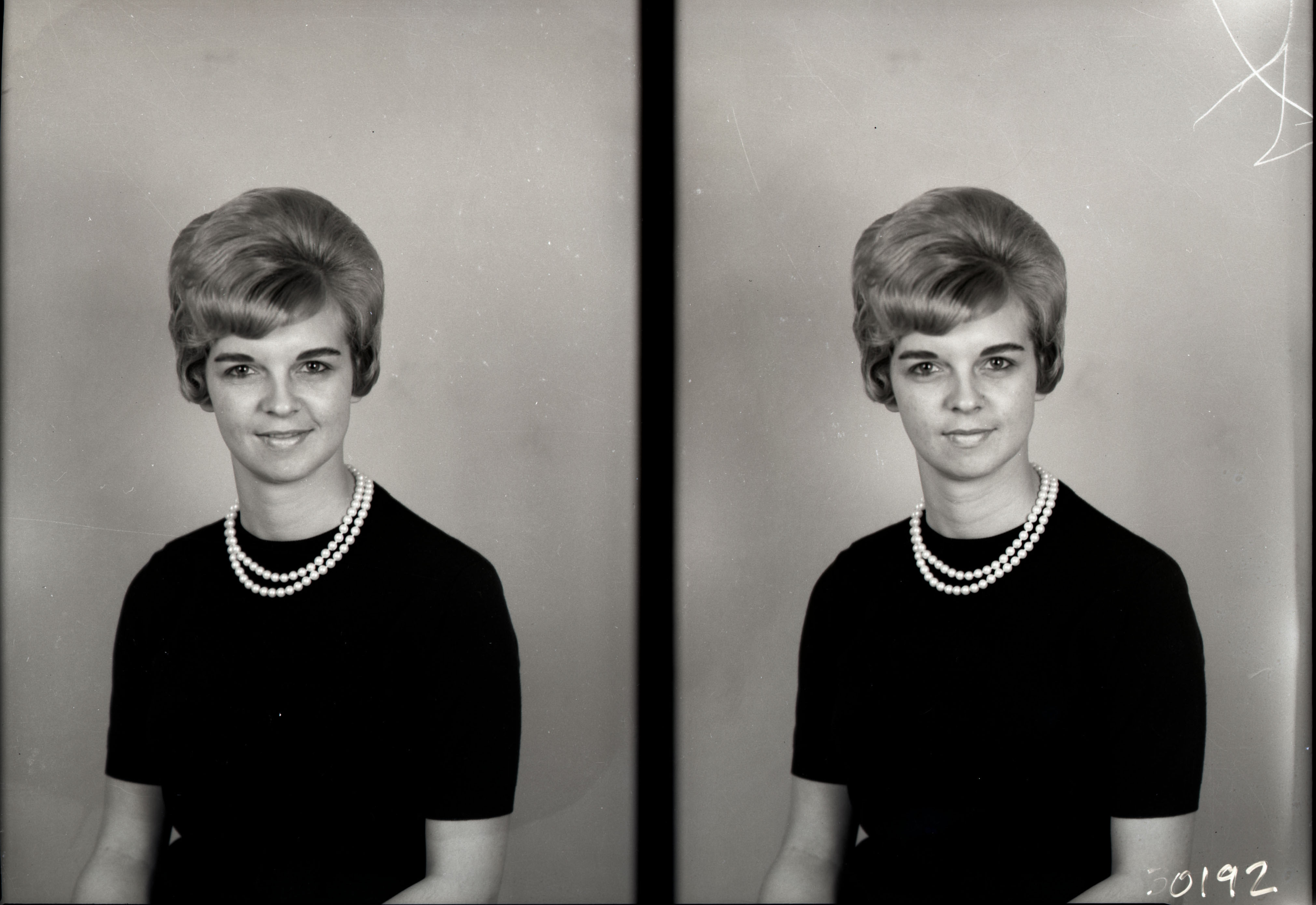 Photo of two separate portrait photographs of the same unidentified young woman with short hair and wearing faux pearls with her short-sleeved dress.