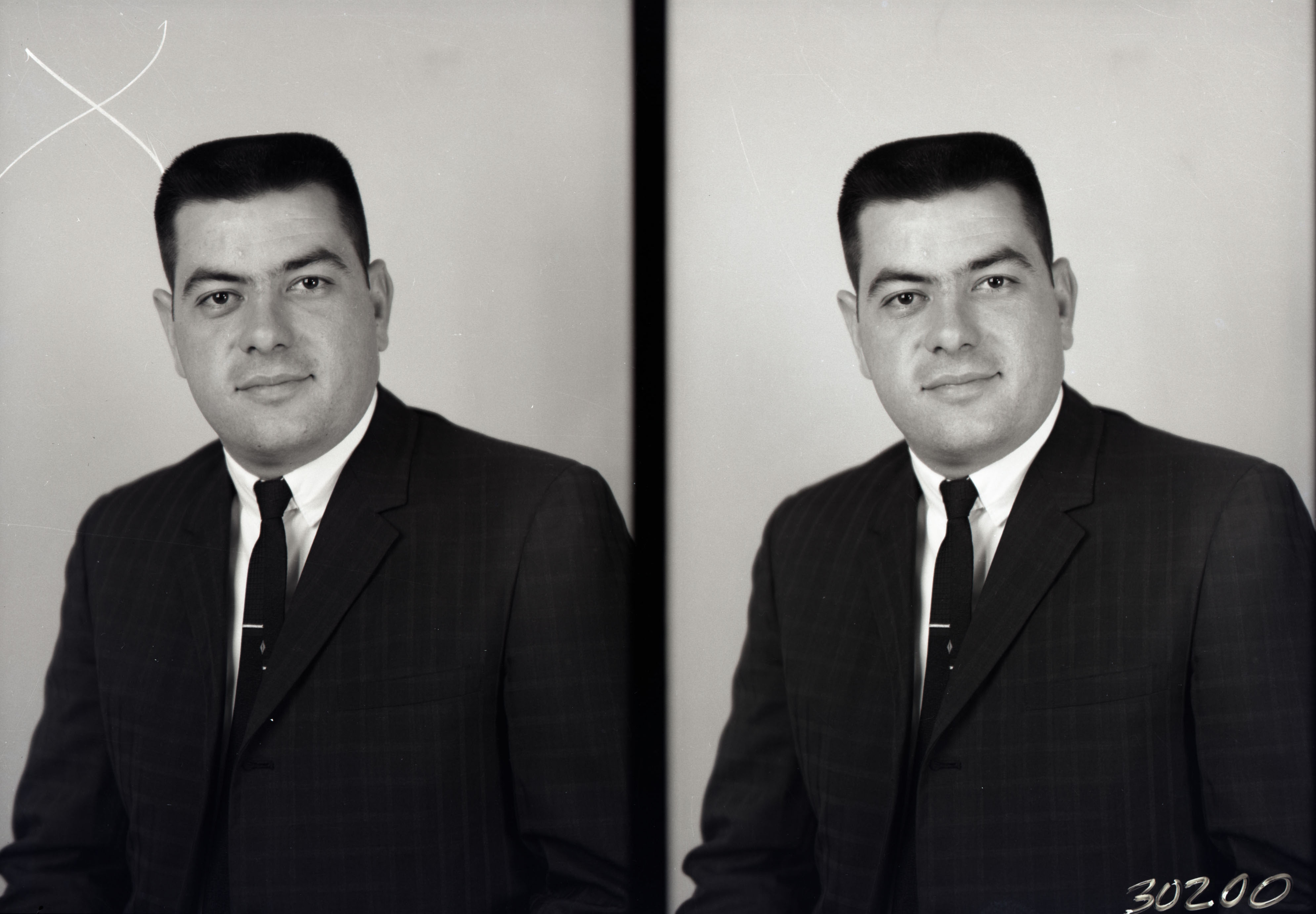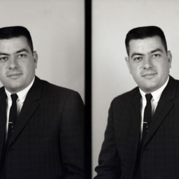 Photo of two separate portrait photographs of the same, unidentified man wearing a suit and tie.