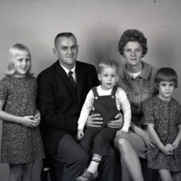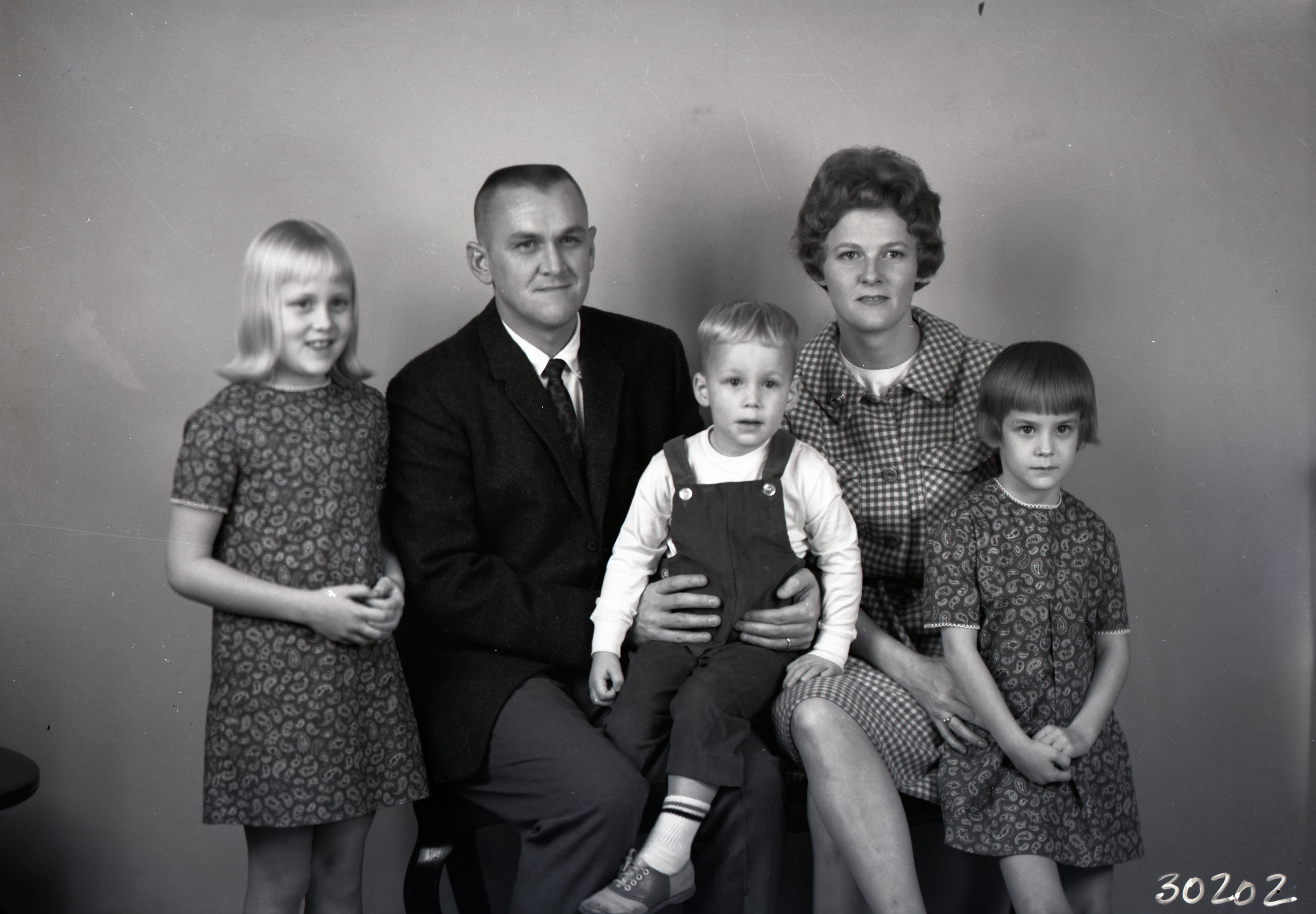 Unidentified man and woman are seated together with three children of varying ages, two girls and a younger boy, posed with them.