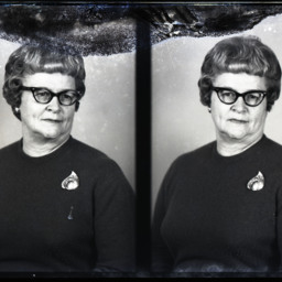 Photo of two separate portrait photographs of an unidentified woman with short hair and glasses. She is wearing a pin on the front of her dress.