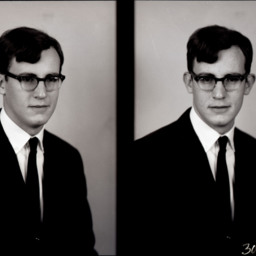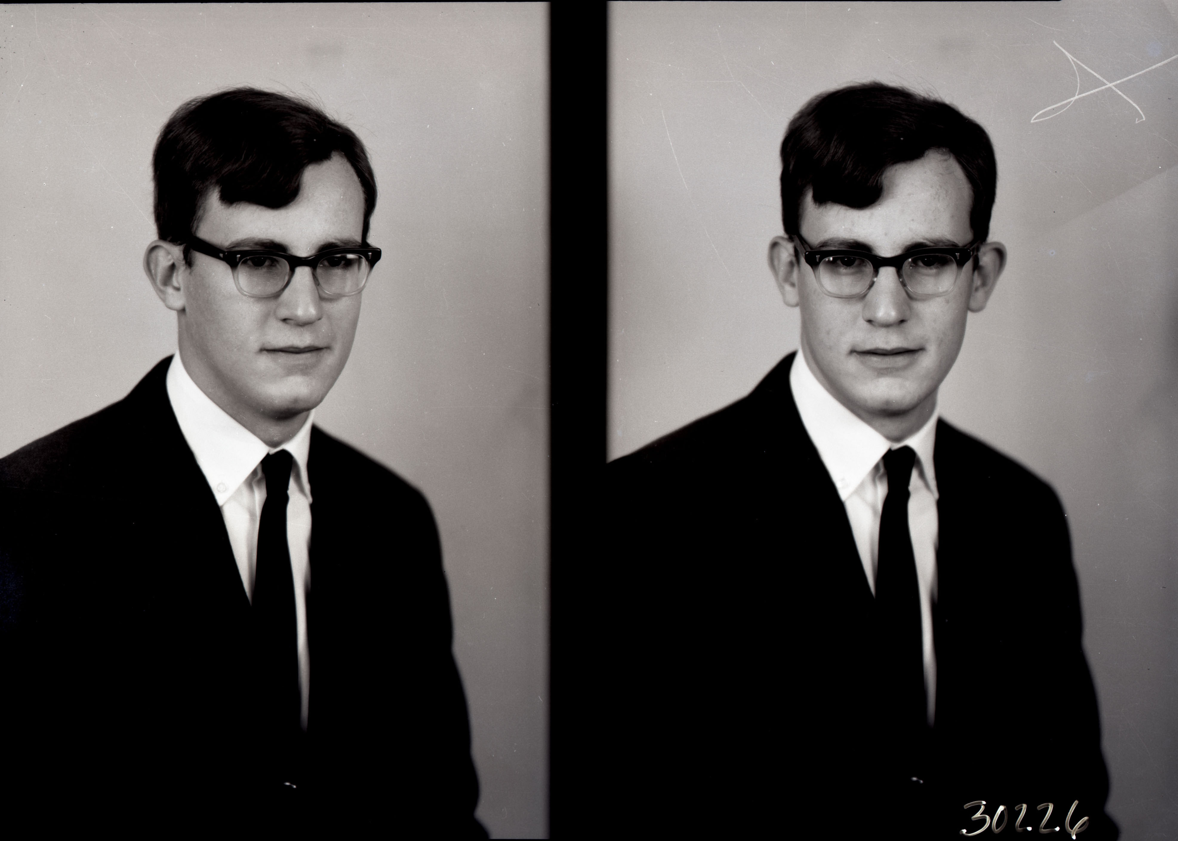 Photo of two separate portrait photographs of the same unidentified young man with glasses and wearing a suit and tie.