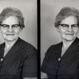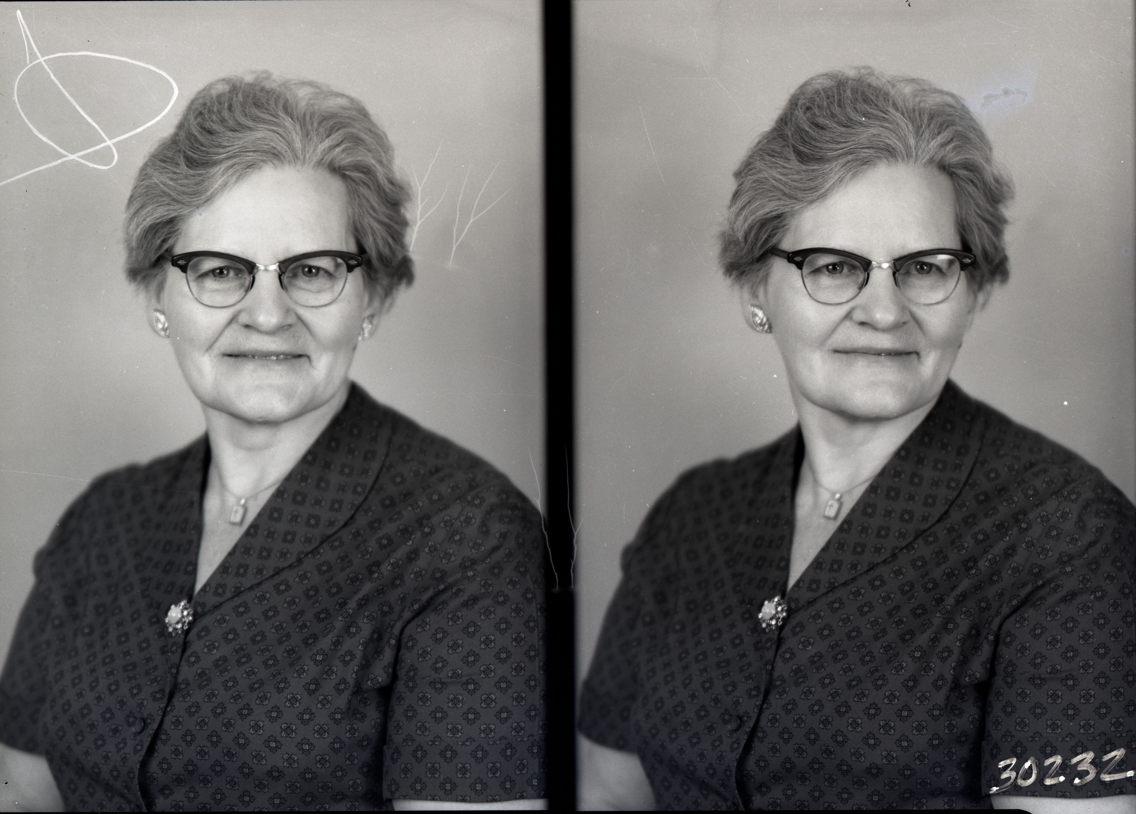 Photo of two separate portrait photographs of an unidentified older woman with glasses and wearing her hair pulled back.
