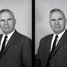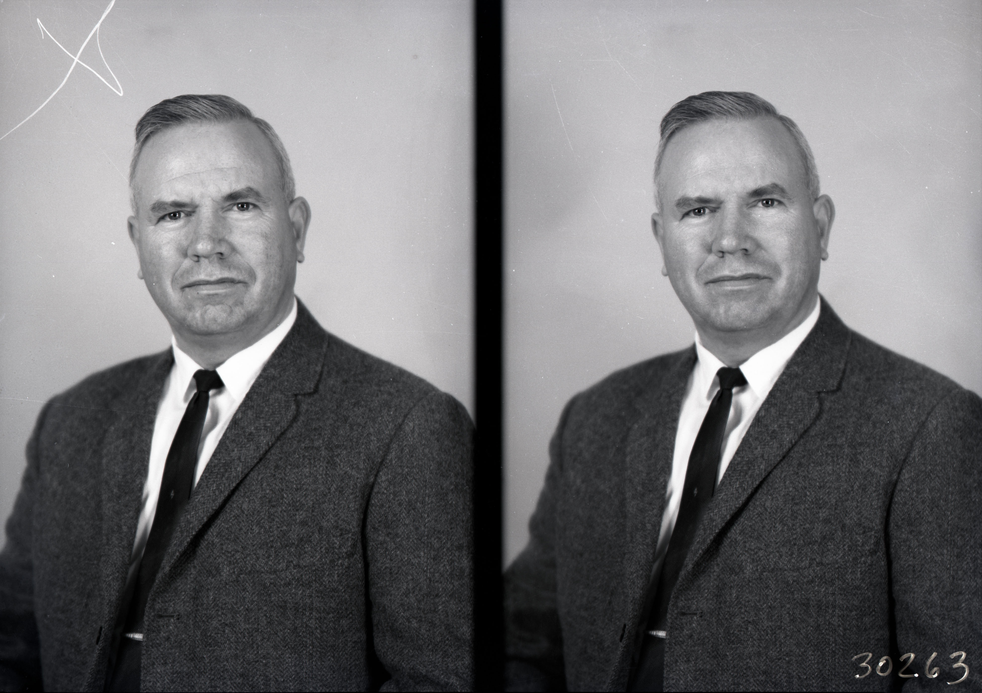 Photo of two separate portrait photographs of the same unidentified man in a suit and tie.