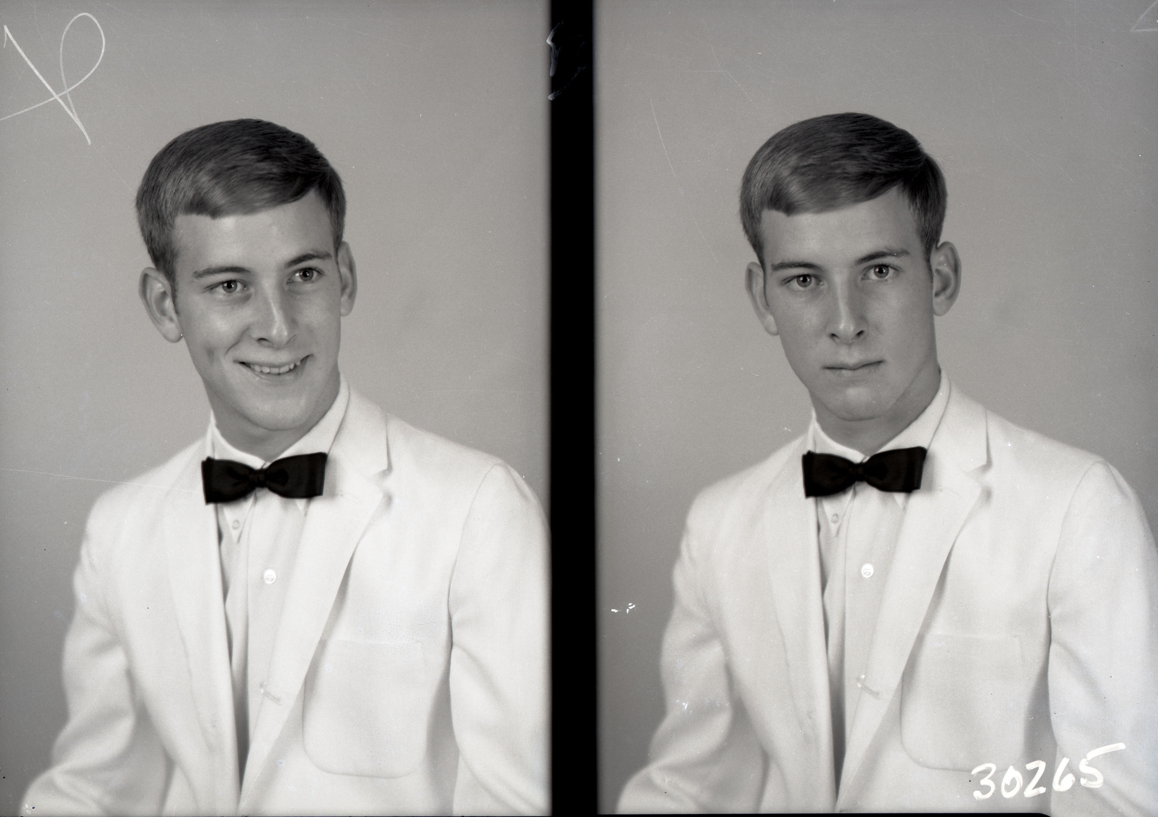 Photo of two separate portrait photographs of Rick Seal as a young man in a formal suit and bow tie.