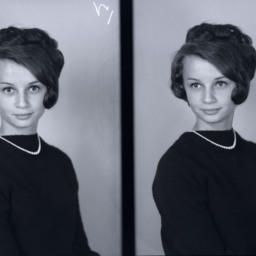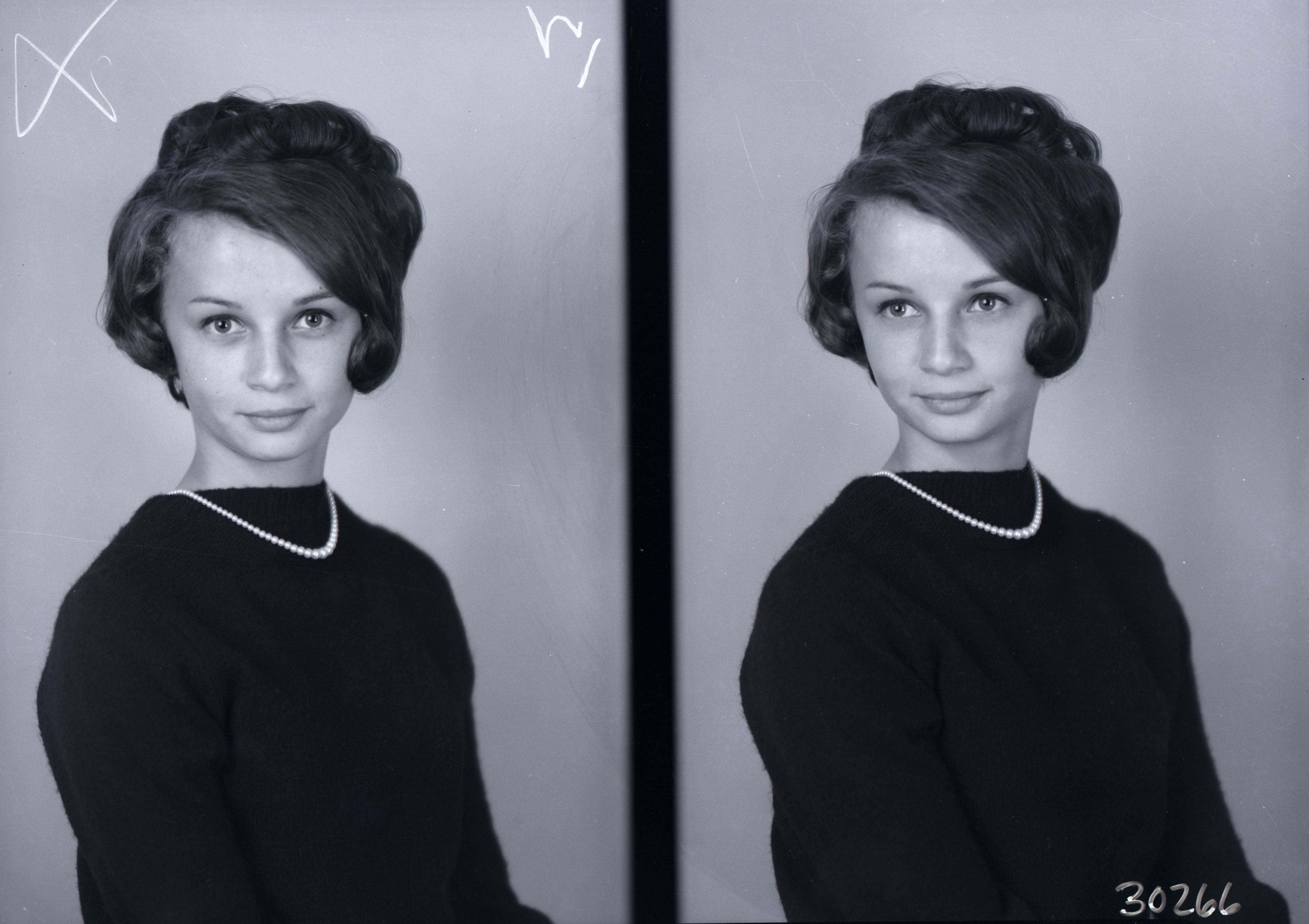 Photo of two separate portrait photographs of the same unidentified young woman with her hair pulled up and wearing faux pearls with her sweater.