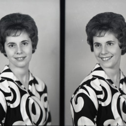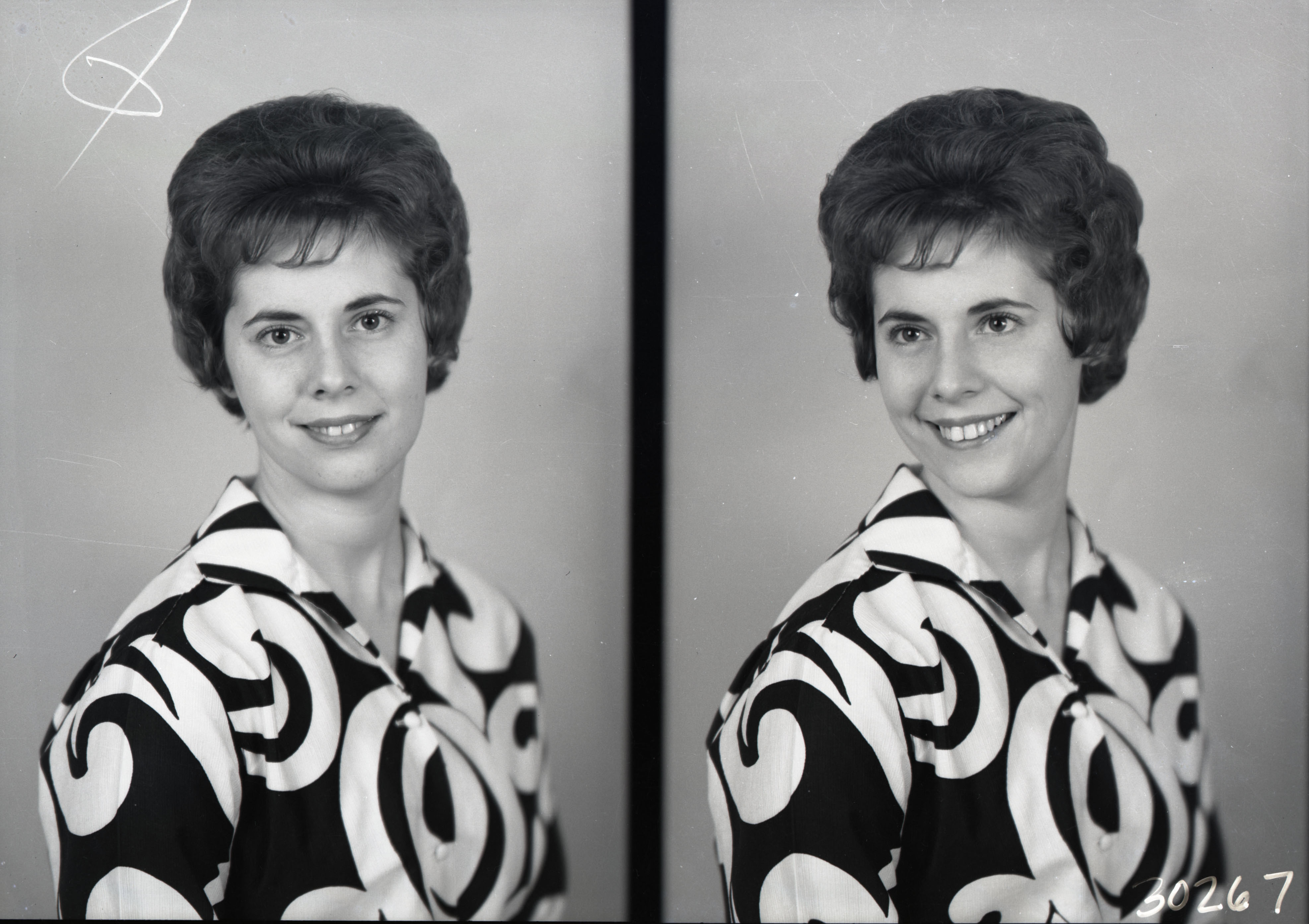 Photo of two separate portrait photographs of the same unidentified woman with short, styled hair and wearing a print dress.