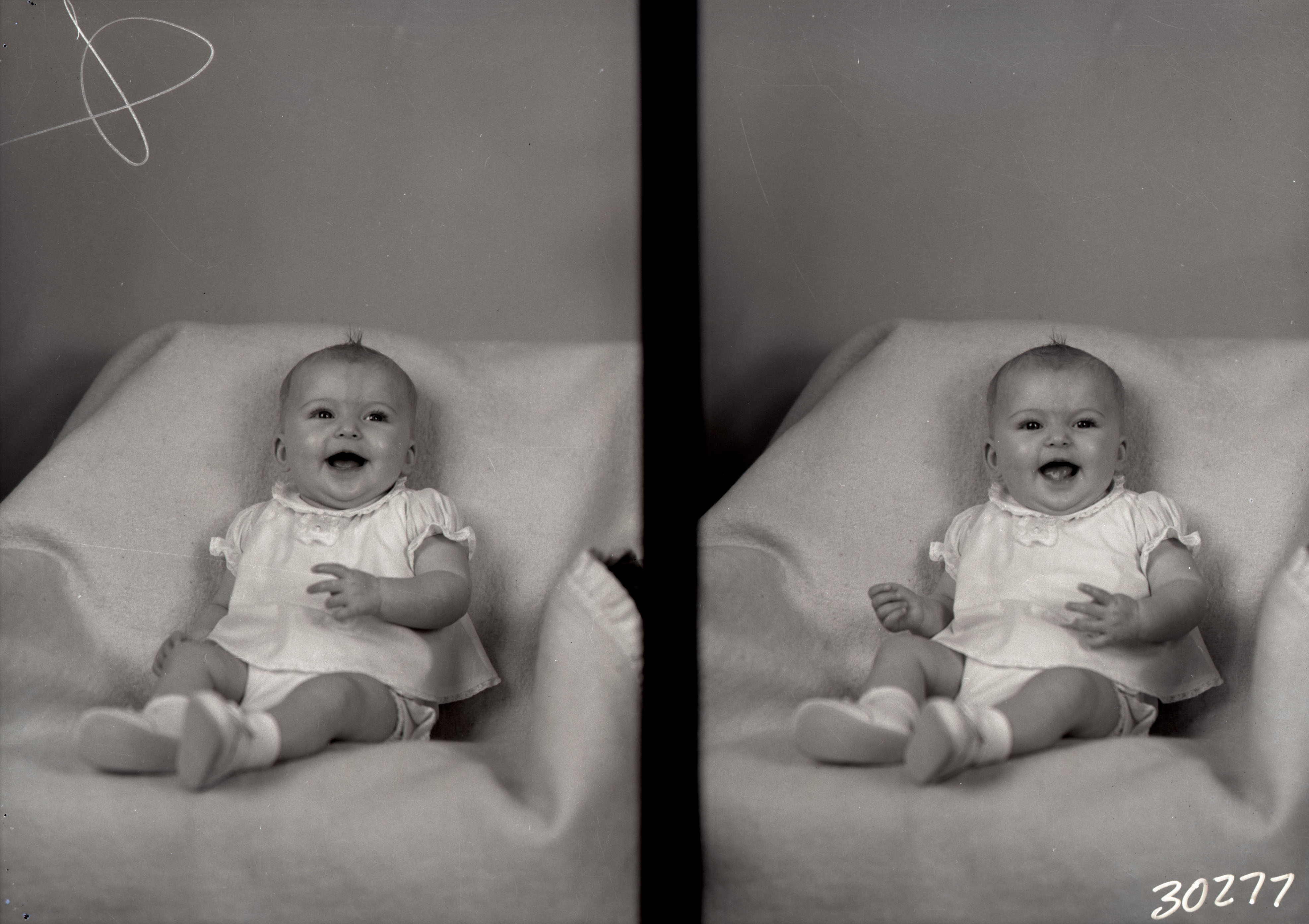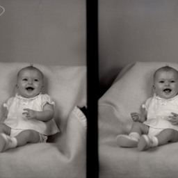 Photo of two separate photographs of the same unidentified and smiling baby posed on a blanket.