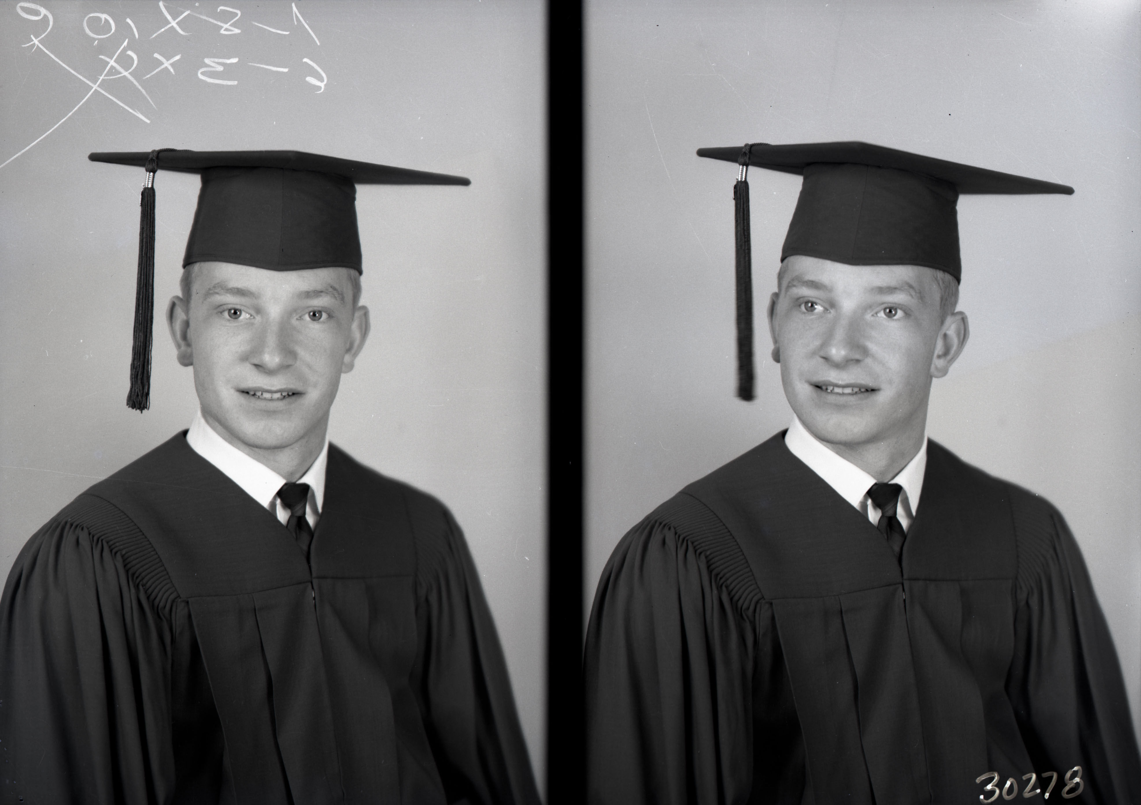 Photo of two separate portrait photographs of either Ronnie or Donnie Hoffman wearing his high school graduation cap and gown.
