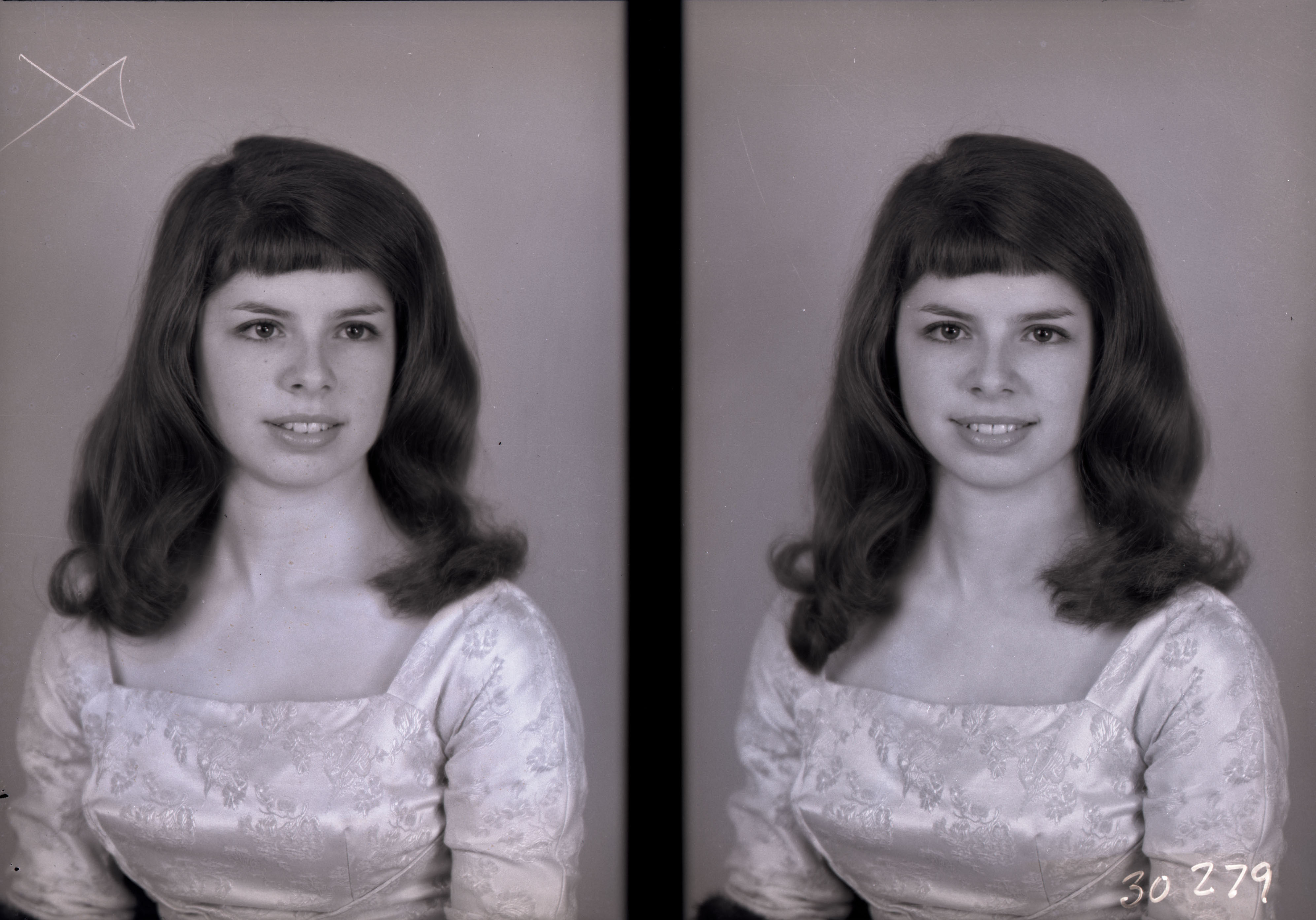Photo of two separate portrait photographs of Cheryl K. (Pence) Rudy as a young woman with long dark hair and bangs.