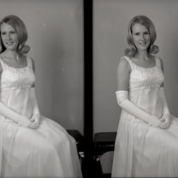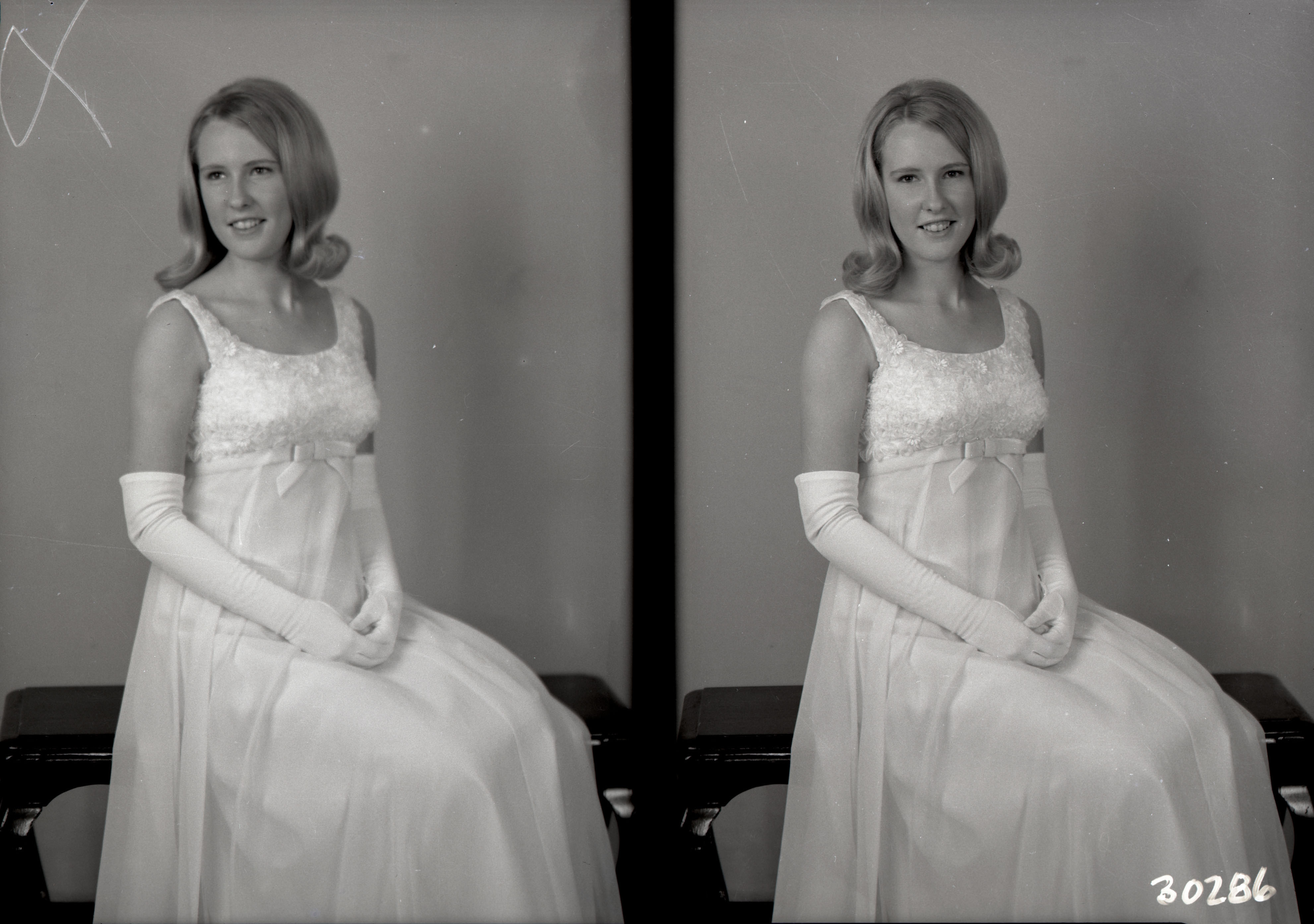 Photo of two separate photographs of a young unidentified woman with shoulder-length hair curled outwards and wearing a formal gown and gloves.