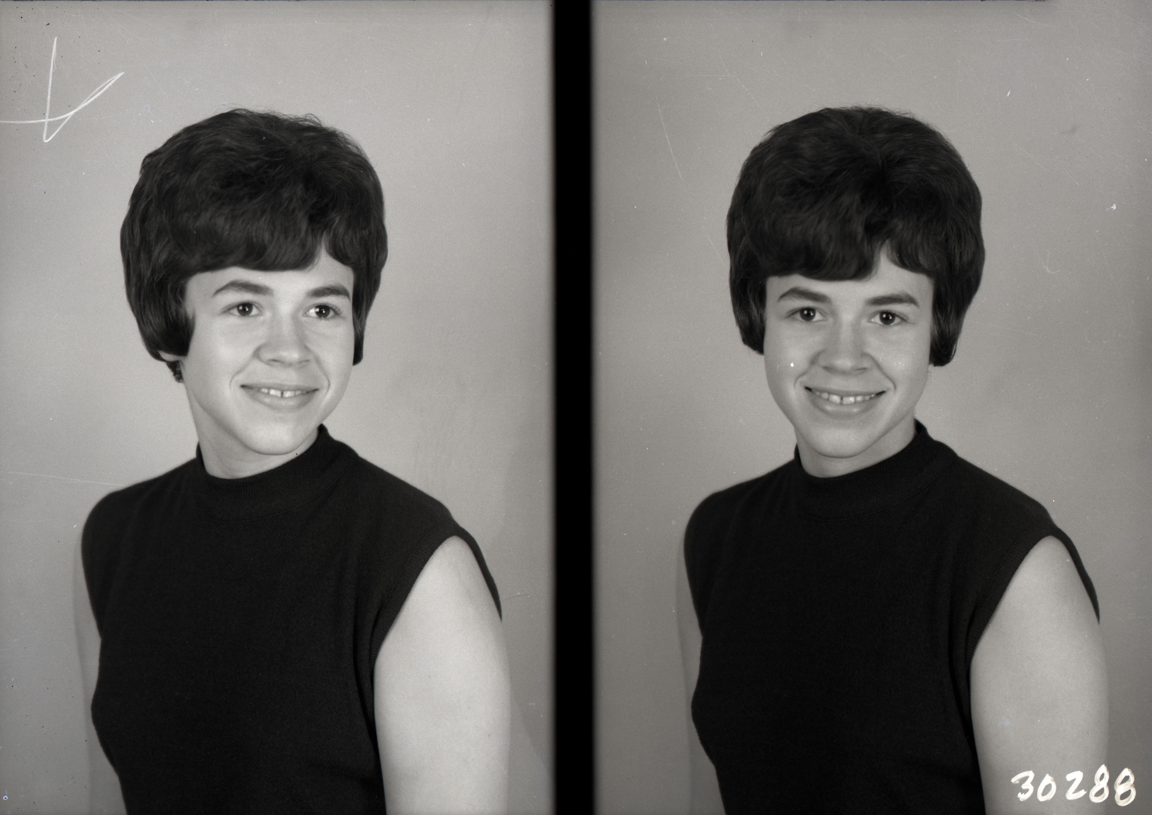 Photo of two separate portrait photographs of Sue Ellen (Wilkins) Windle as a young woman with short hair and wearing a sleeveless top.