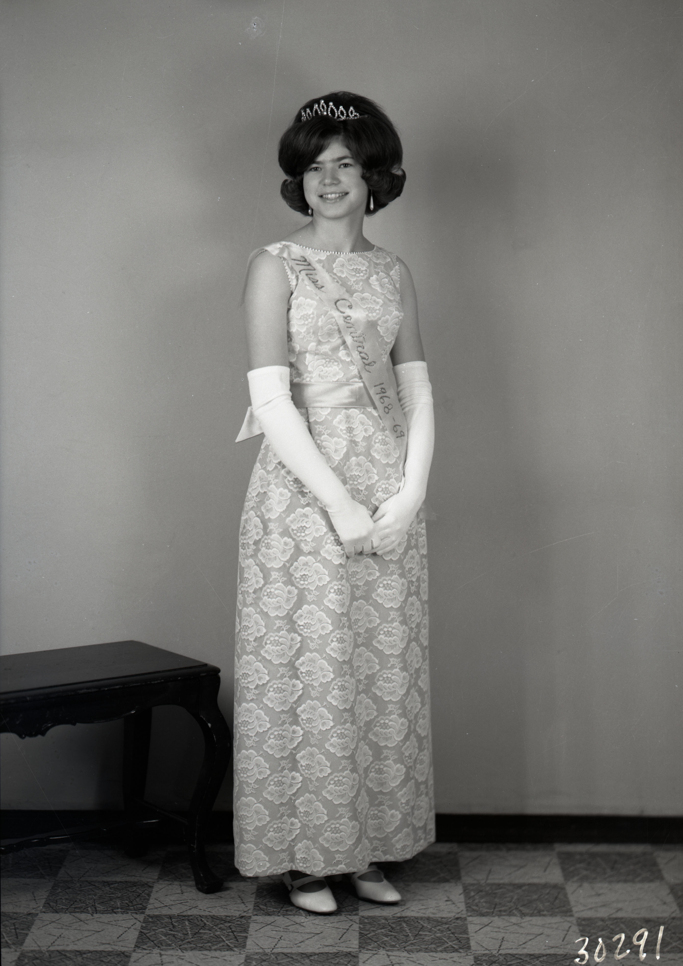 Photograph of Jennie Day (Foltz) Miller standing in a formal gown, long gloves, and wearing a sash that says, "Miss Central 1968-1969".