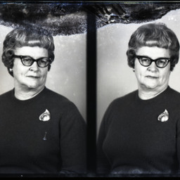 Photo of two separate portrait photographs of the same unidentified woman with glasses and short hair.