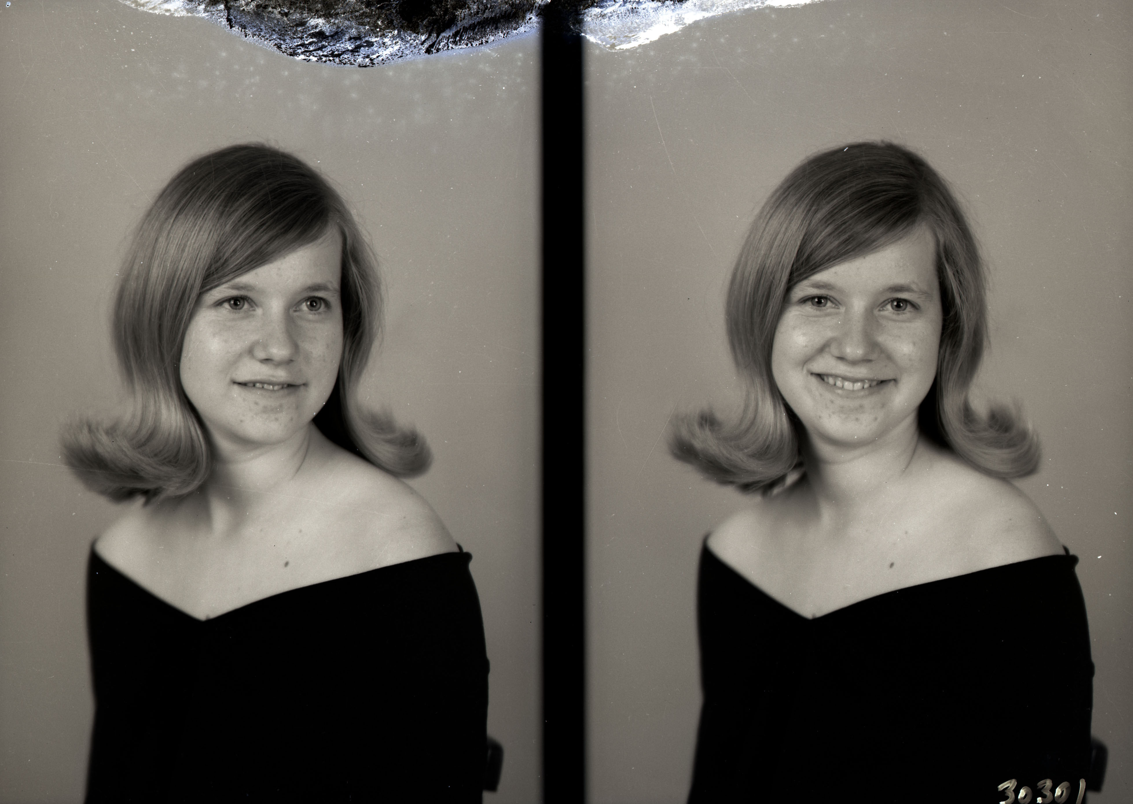 Photo of two separate portrait photographs of Mary Sue (McNeal) Foltz as a young woman with shoulder-length hair curled outwards.