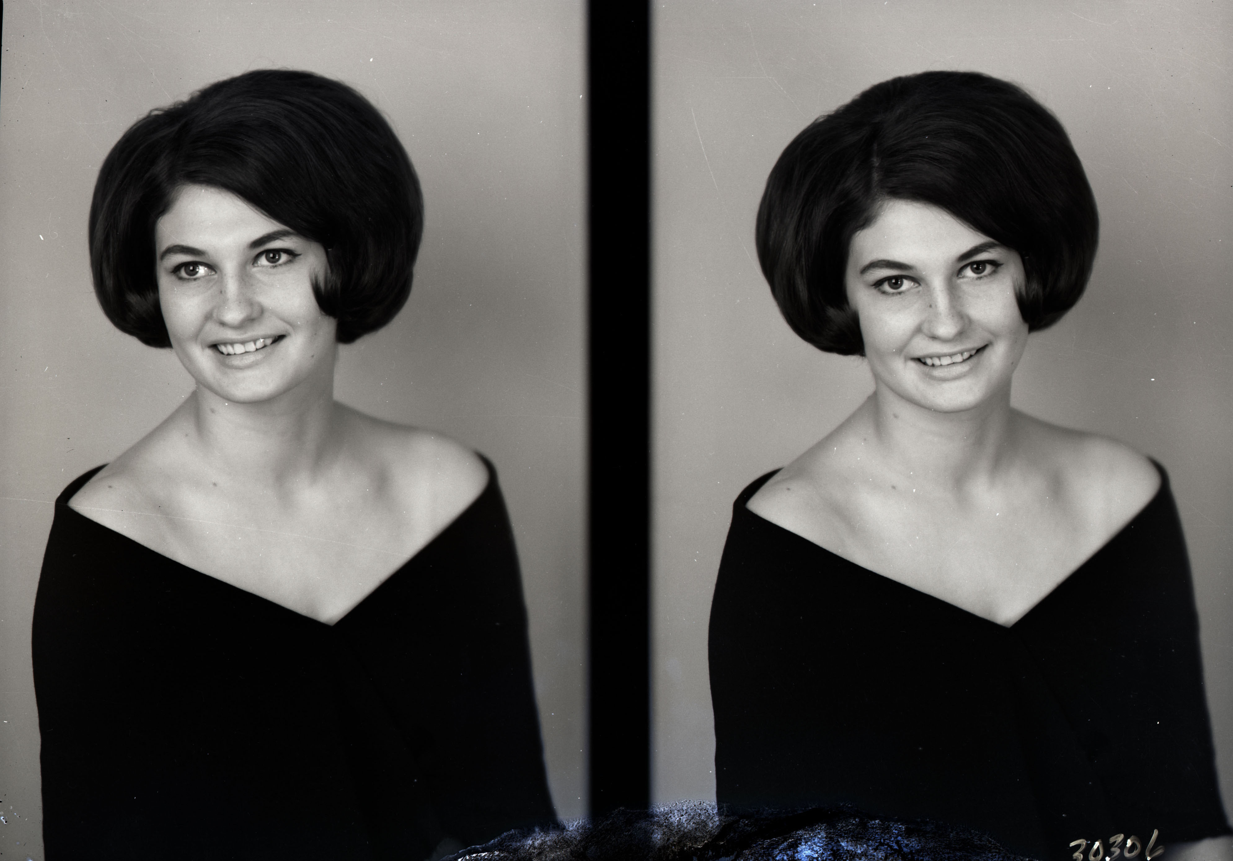 Photo of two separate portrait photographs of the same unidentified young woman with short, styled hair.