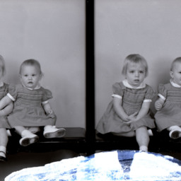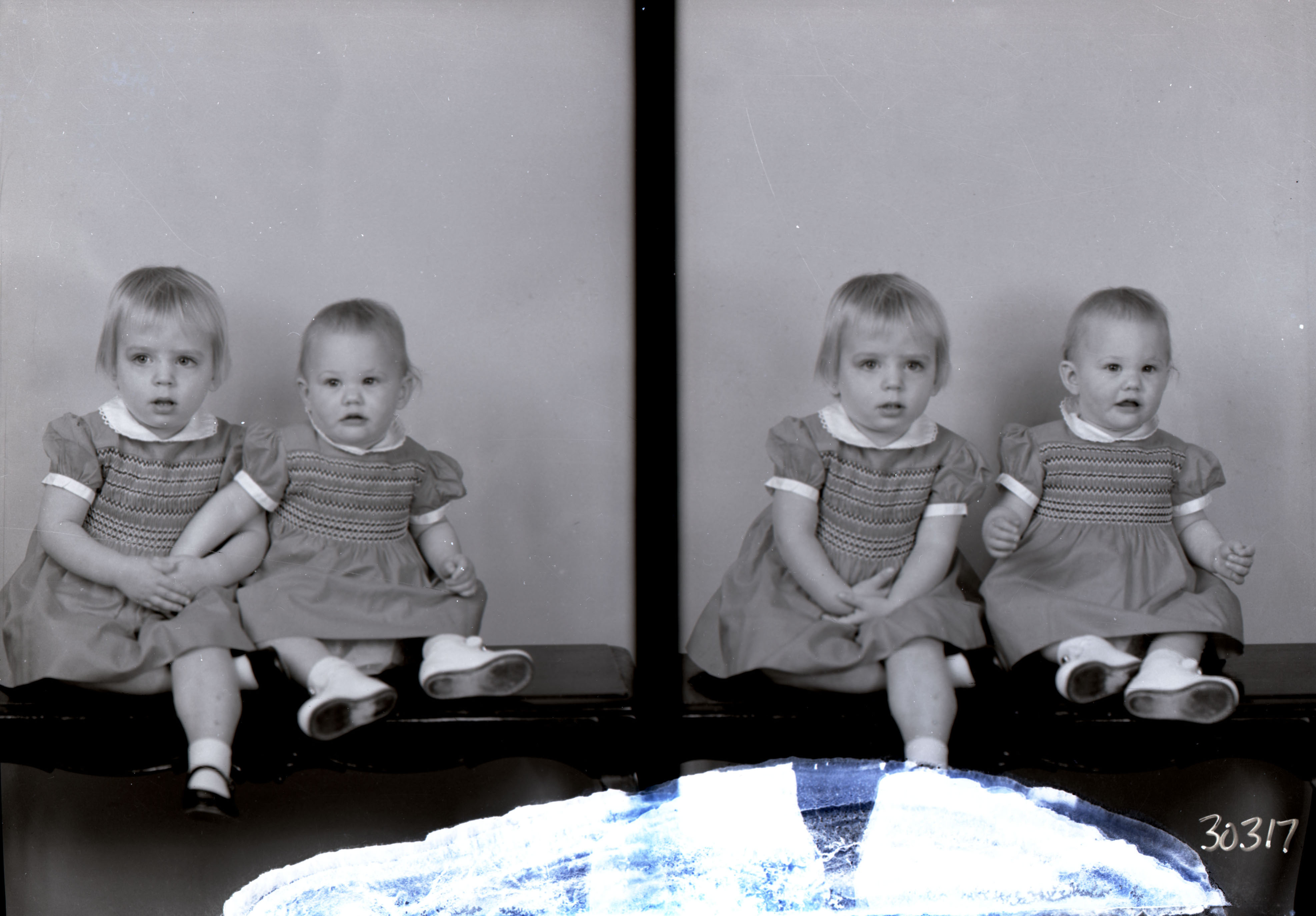 Photo of two separate photographs of two unidentified little girls seated together and wearing matching dresses.