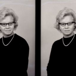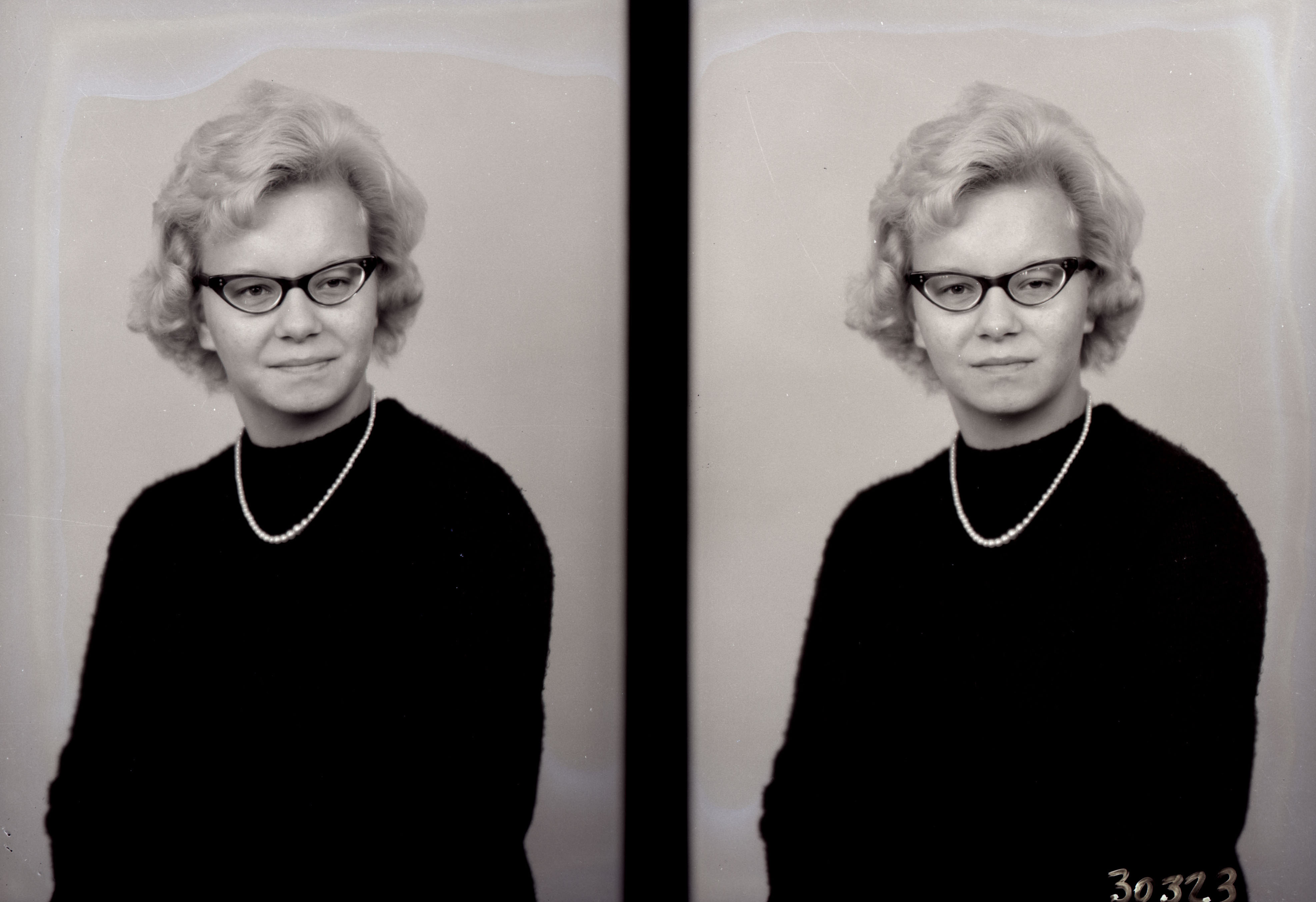 Photo of two separate portrait photographs of the same unidentified woman with short hair, glasses, and wearing a faux pearl necklace.