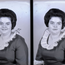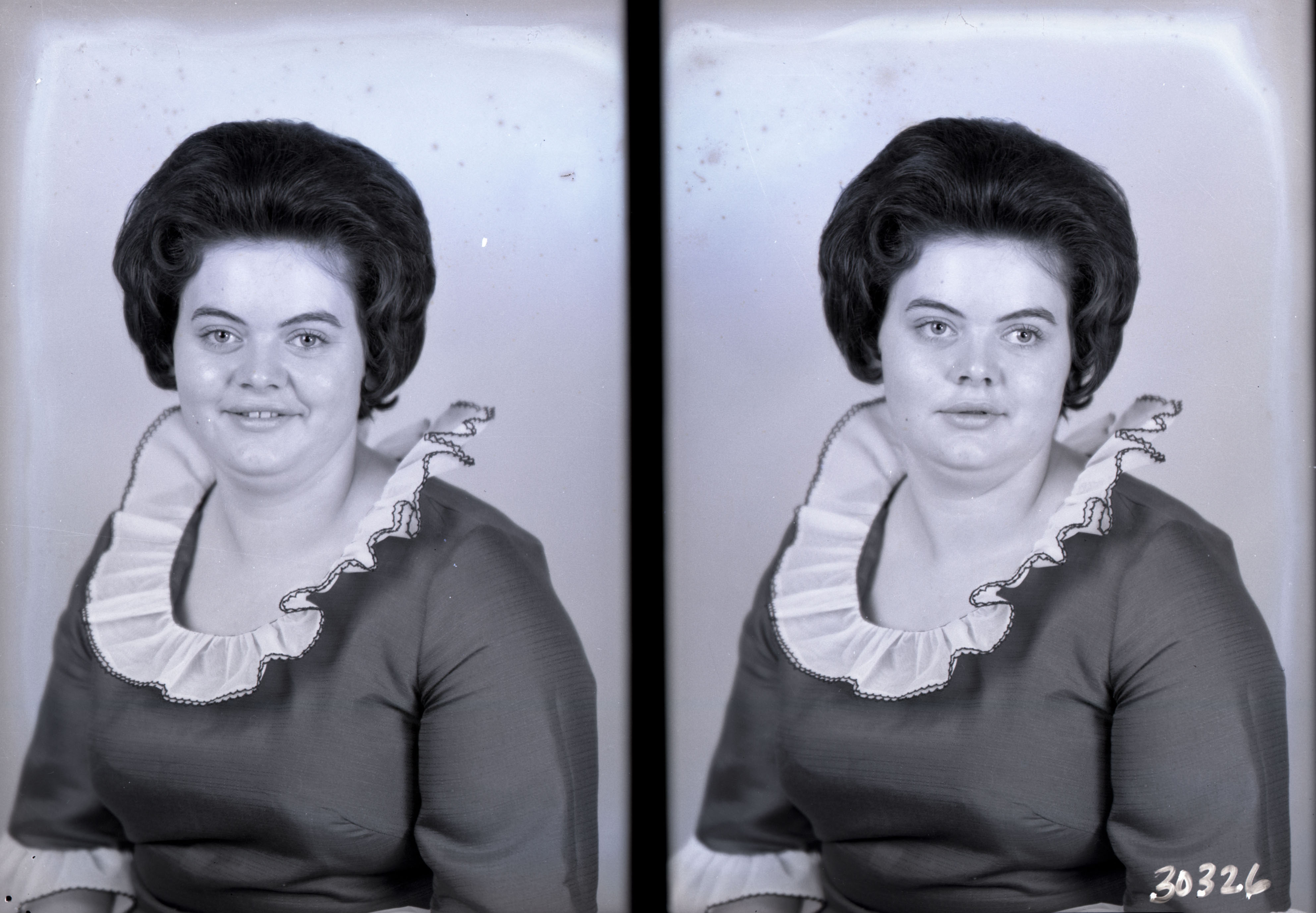 Photo of two separate portrait photographs of the same unidentified woman with styled hair and wearing a dress with ruffles around the neckline.