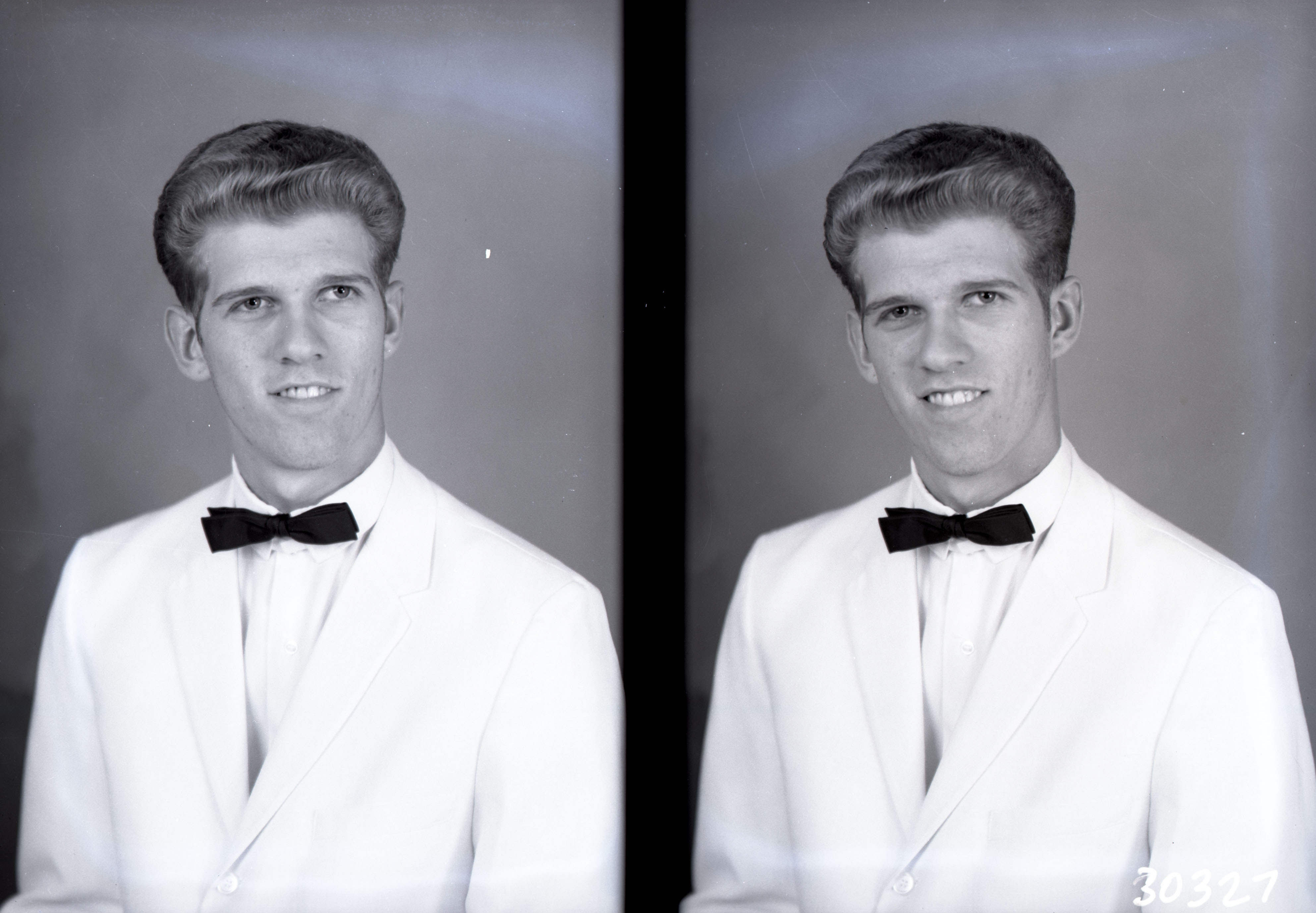 Photo of two separate portrait photographs of Nelson Borden as a young man in a white suit and black bow tie.