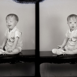 Photo of two separate photographs of the same unidentified young boy seated on a bench.