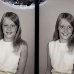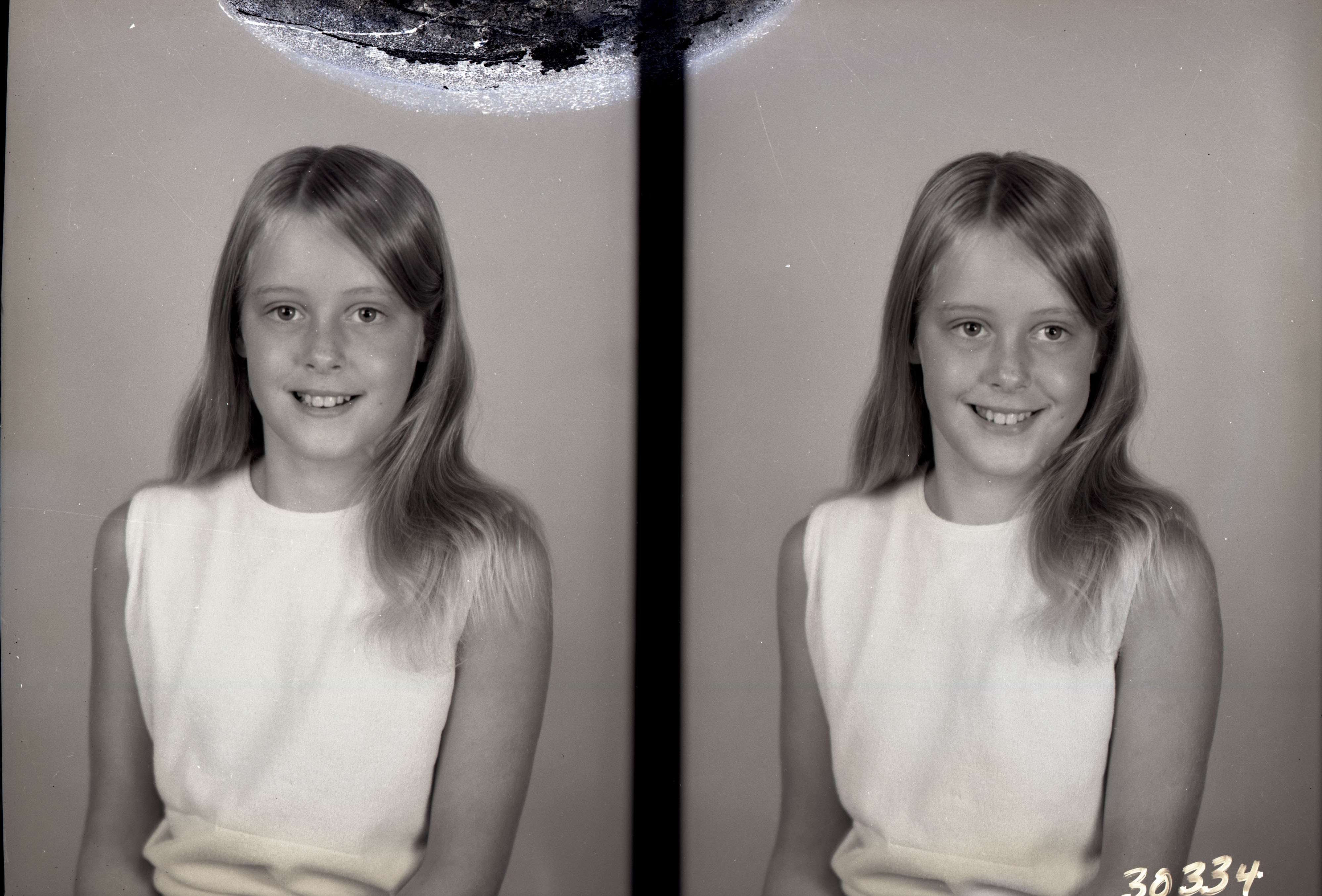 Photo of two separate portrait photographs of the same unidentified girl with long, straight hair and wearing a sleeveless dress.