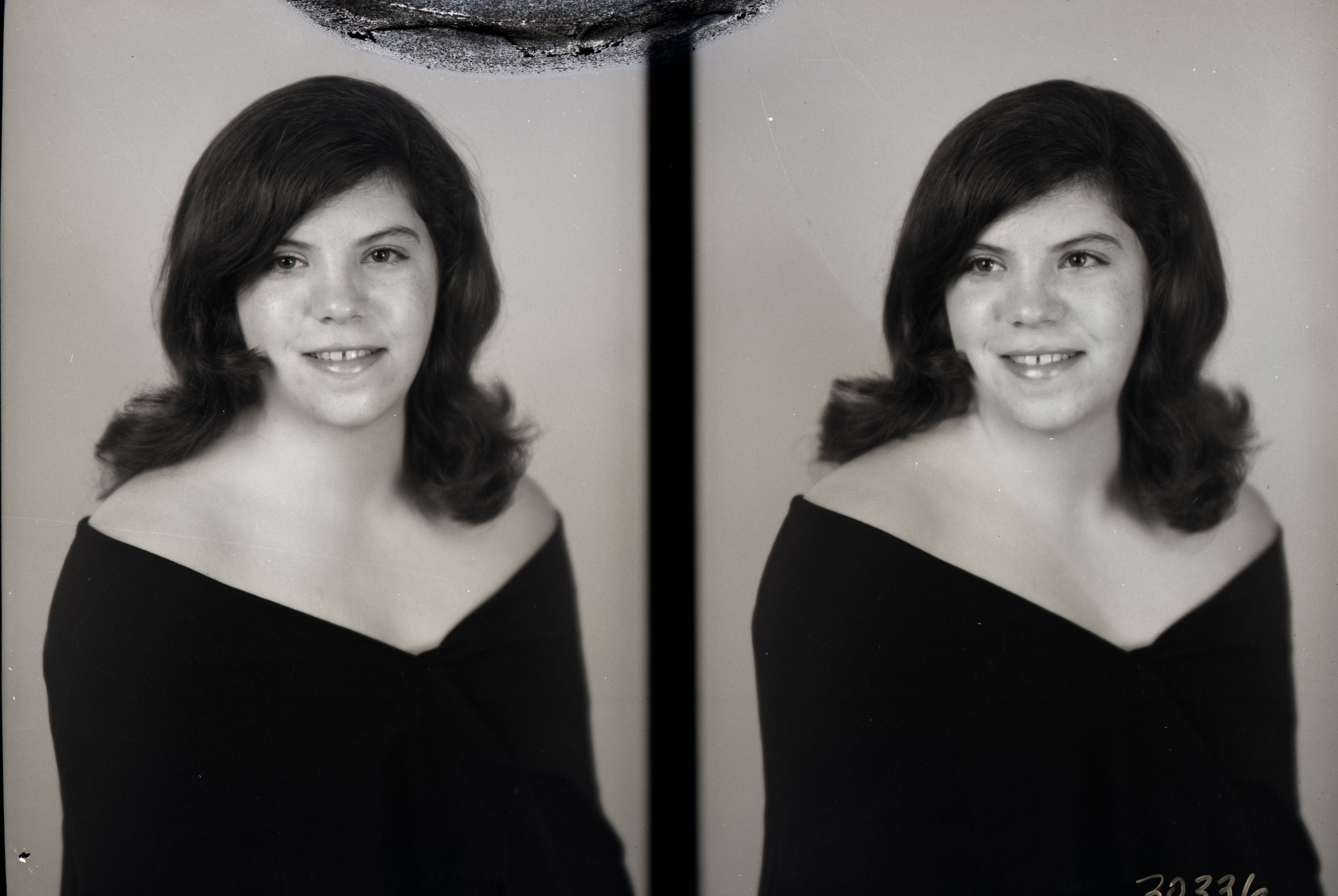 Photo of two separate portrait photographs of April Louise (Allen) Whitmer as a young woman.