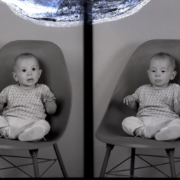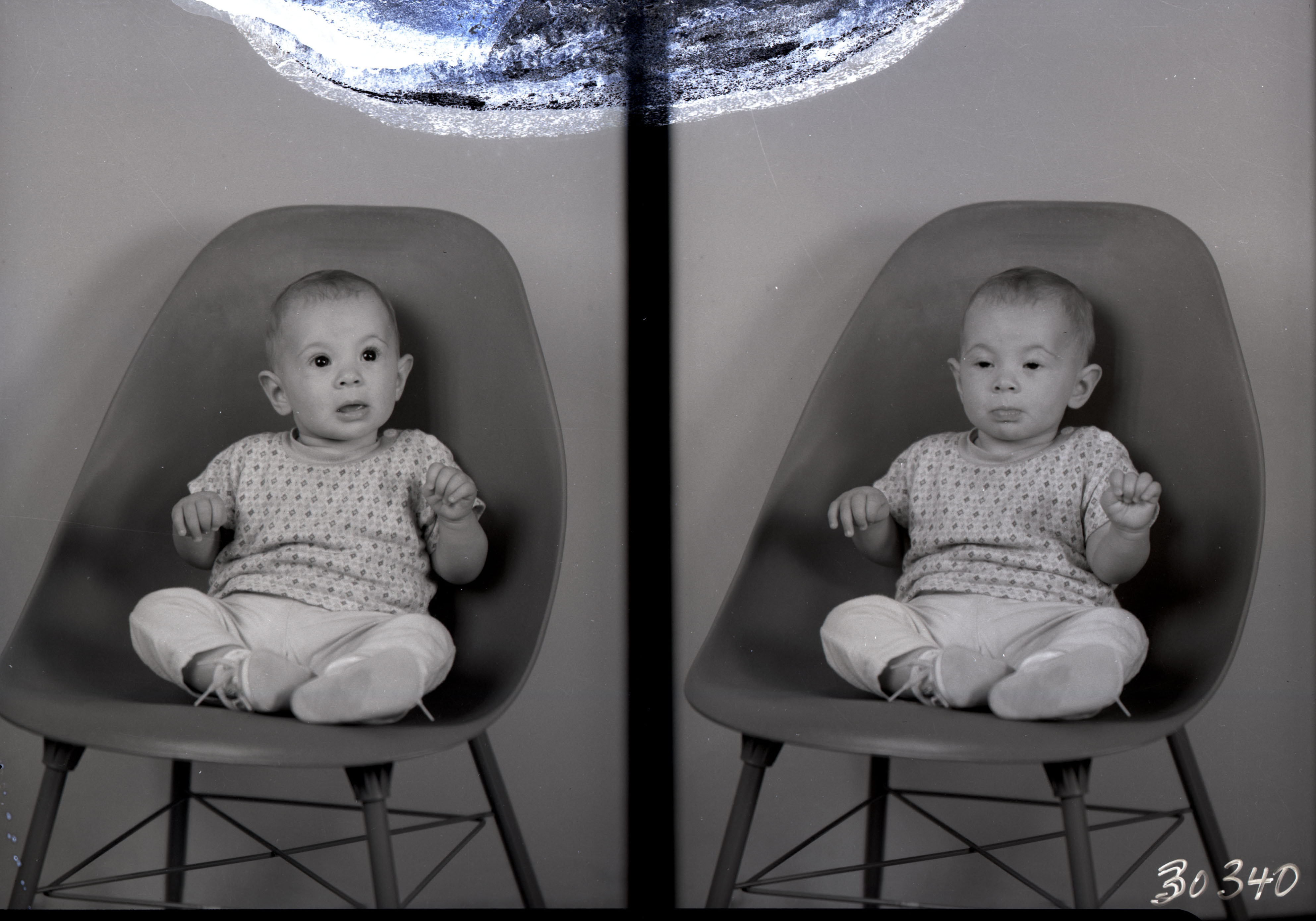 Photo of two separate photographs of the same unidentified young child seated on a chair.