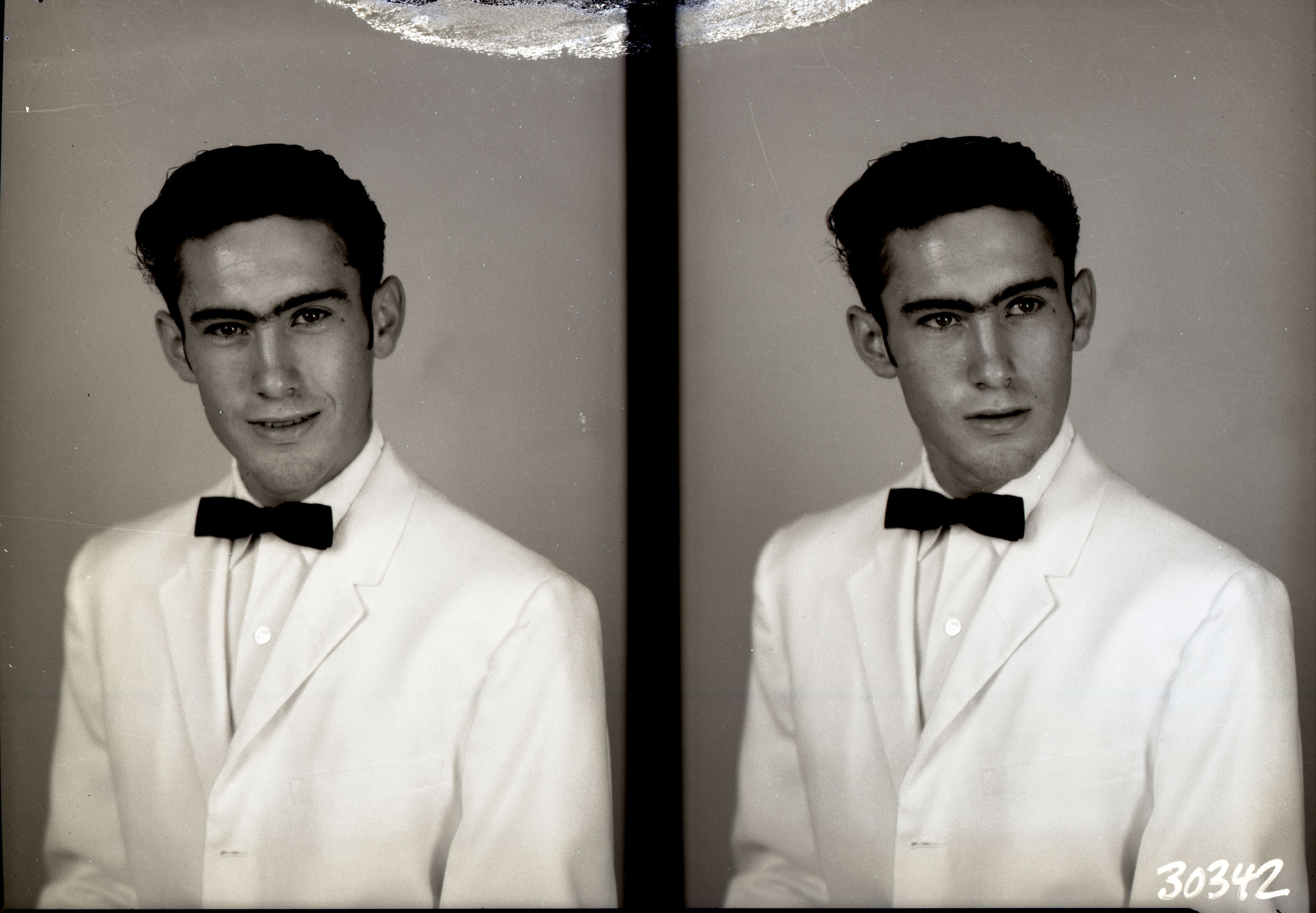 Photo of two separate portrait photographs of Cletus E. Miller, Jr. as a young man in a white suit and dark bow tie.