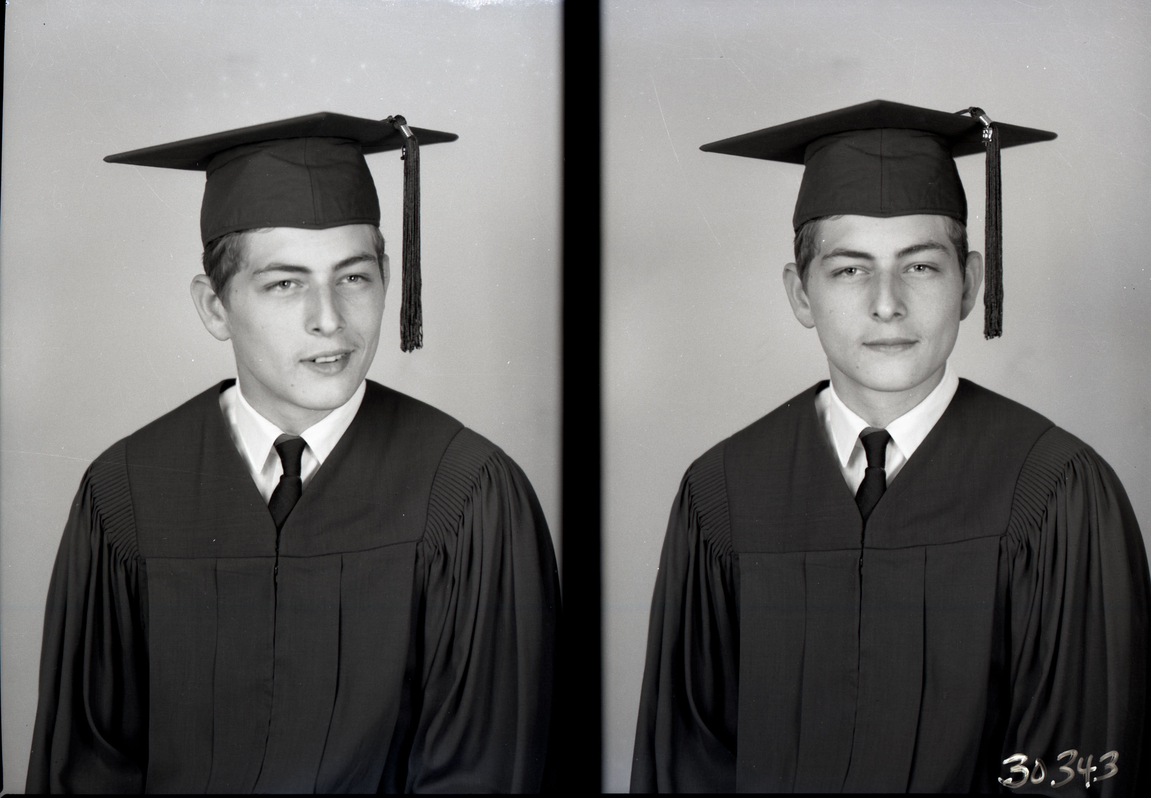 Photo of two separate portrait photographs of Jimmy Newland in a graduation cap and gown.