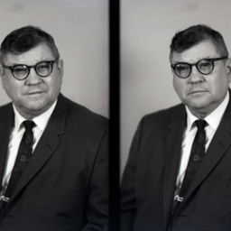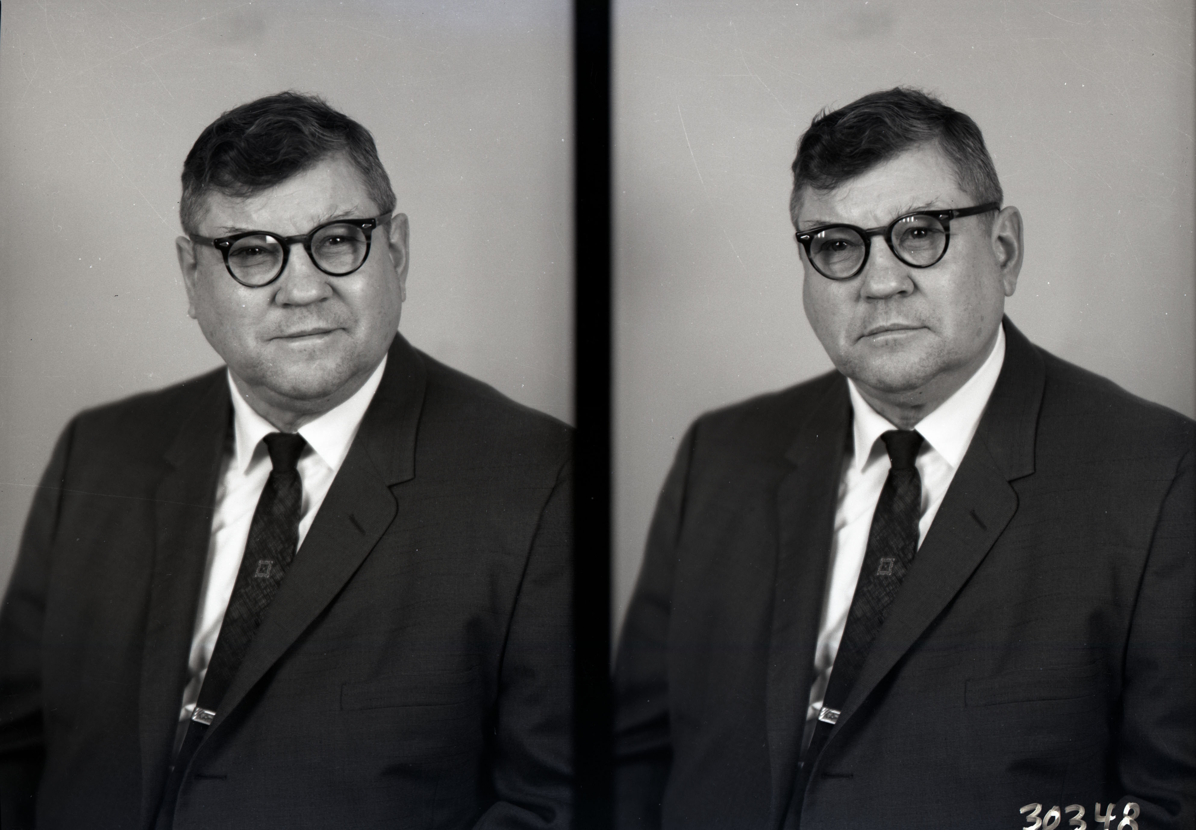 Photo of two separate portrait photographs of the same unidentified man with glasses and wearing a suit and tie.
