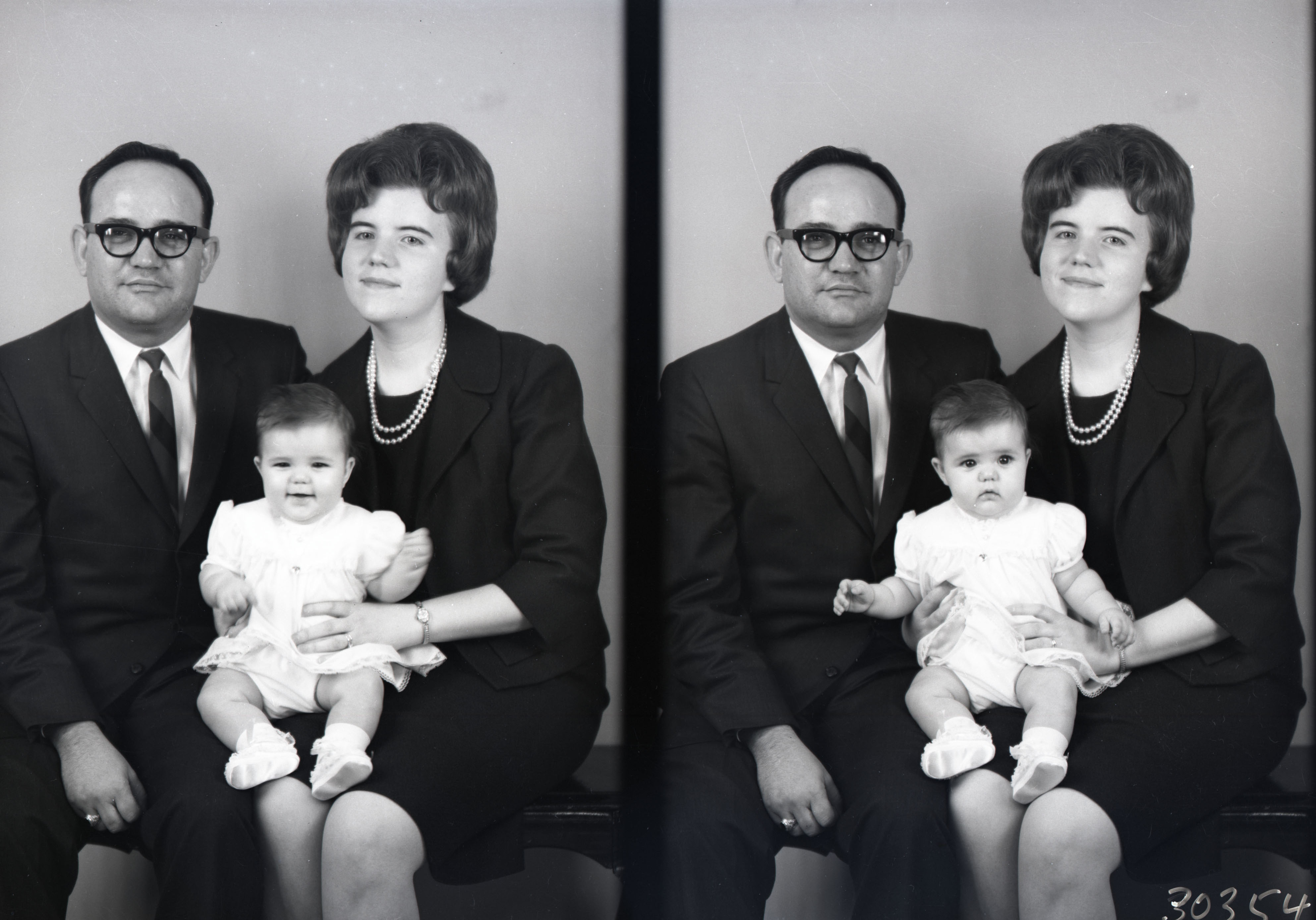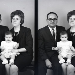 Photo of two separate photographs of the same unidentified man, woman, and young child seated together.