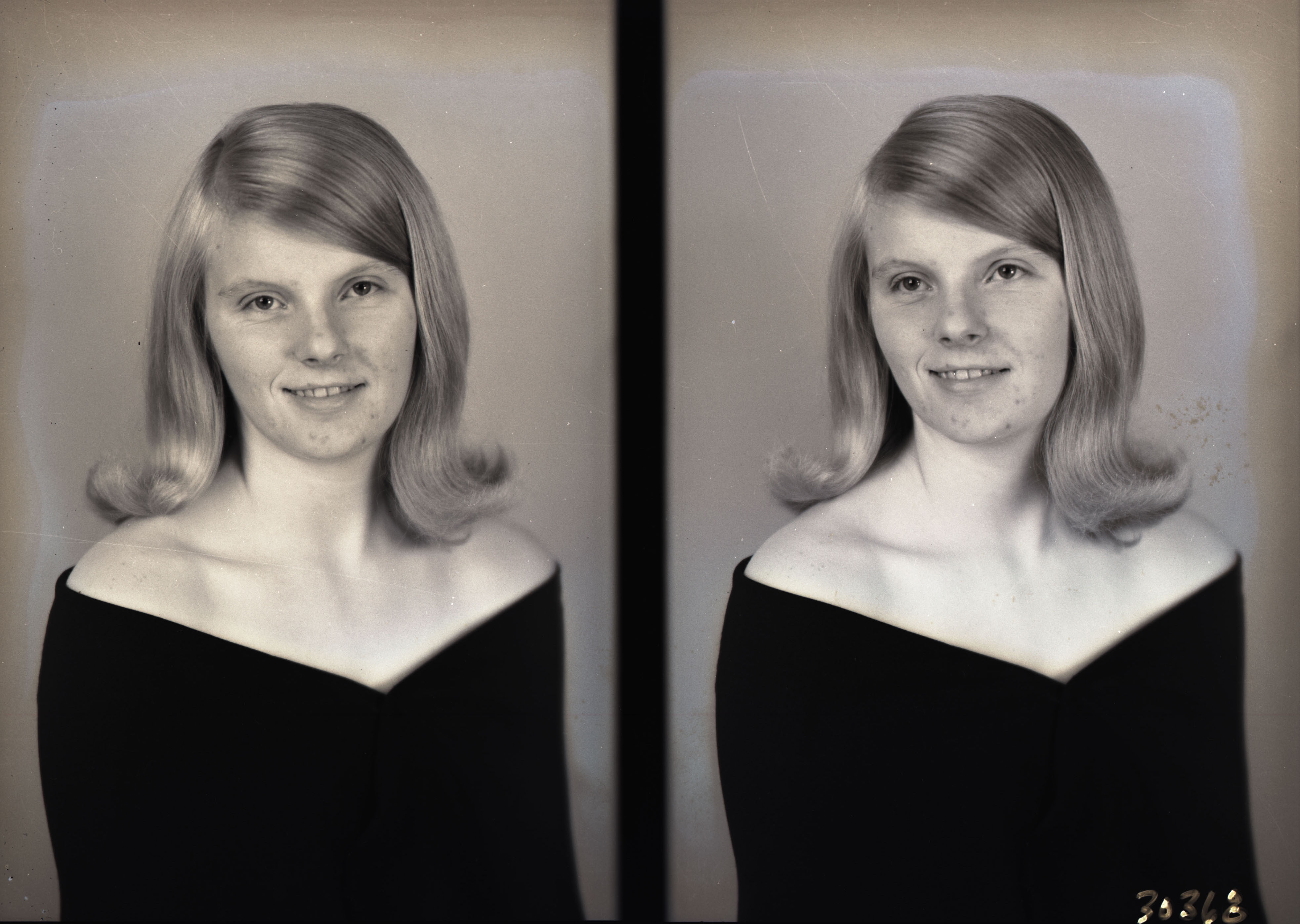 Photo of two separate portrait photographs o Linda Green as a young woman with shoulder-length straight blond hair.