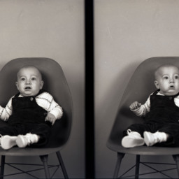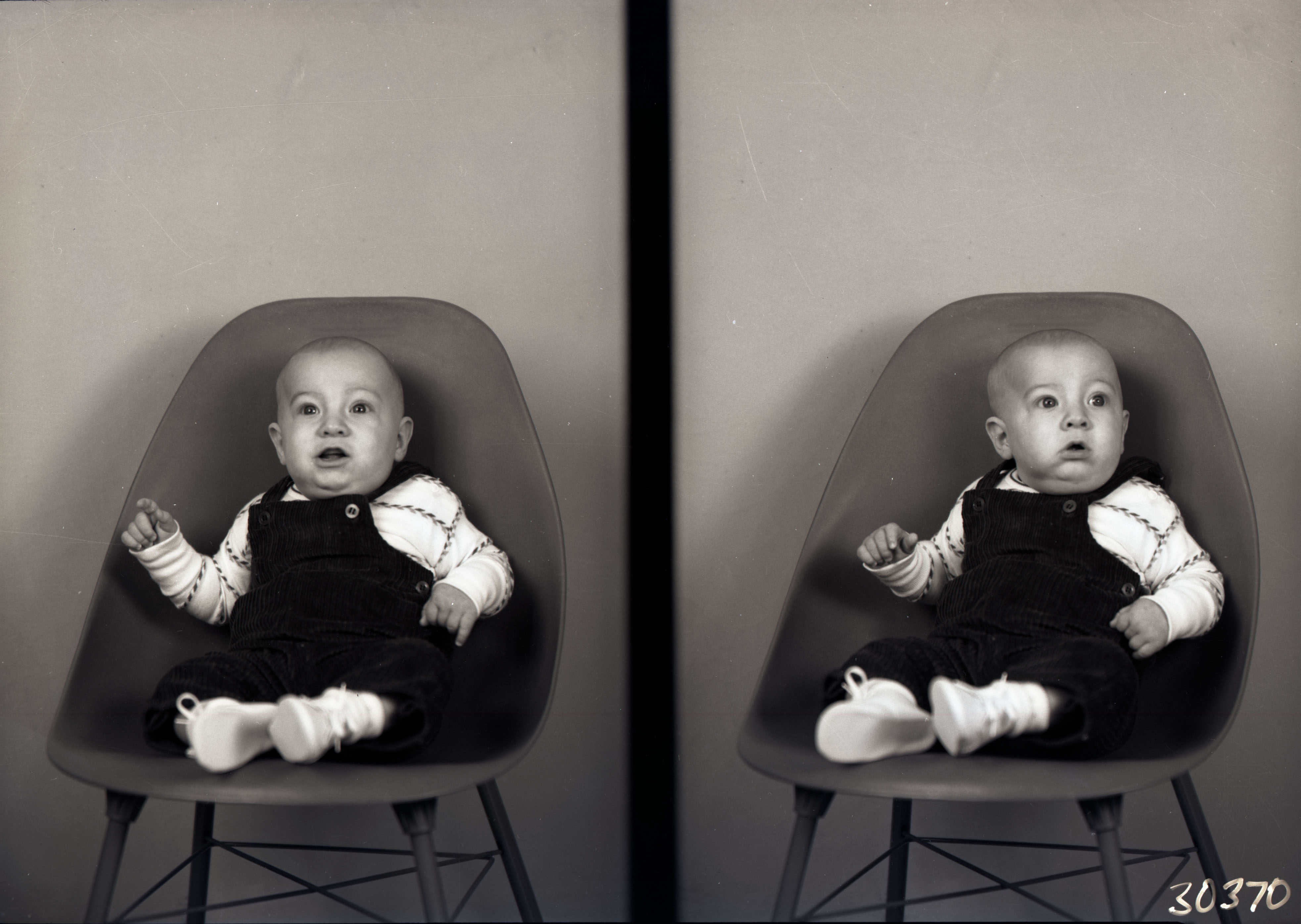 Photo of two separate photographs of the same unidentified young child in overalls and long-sleeved shirt. He is propped on a chair.